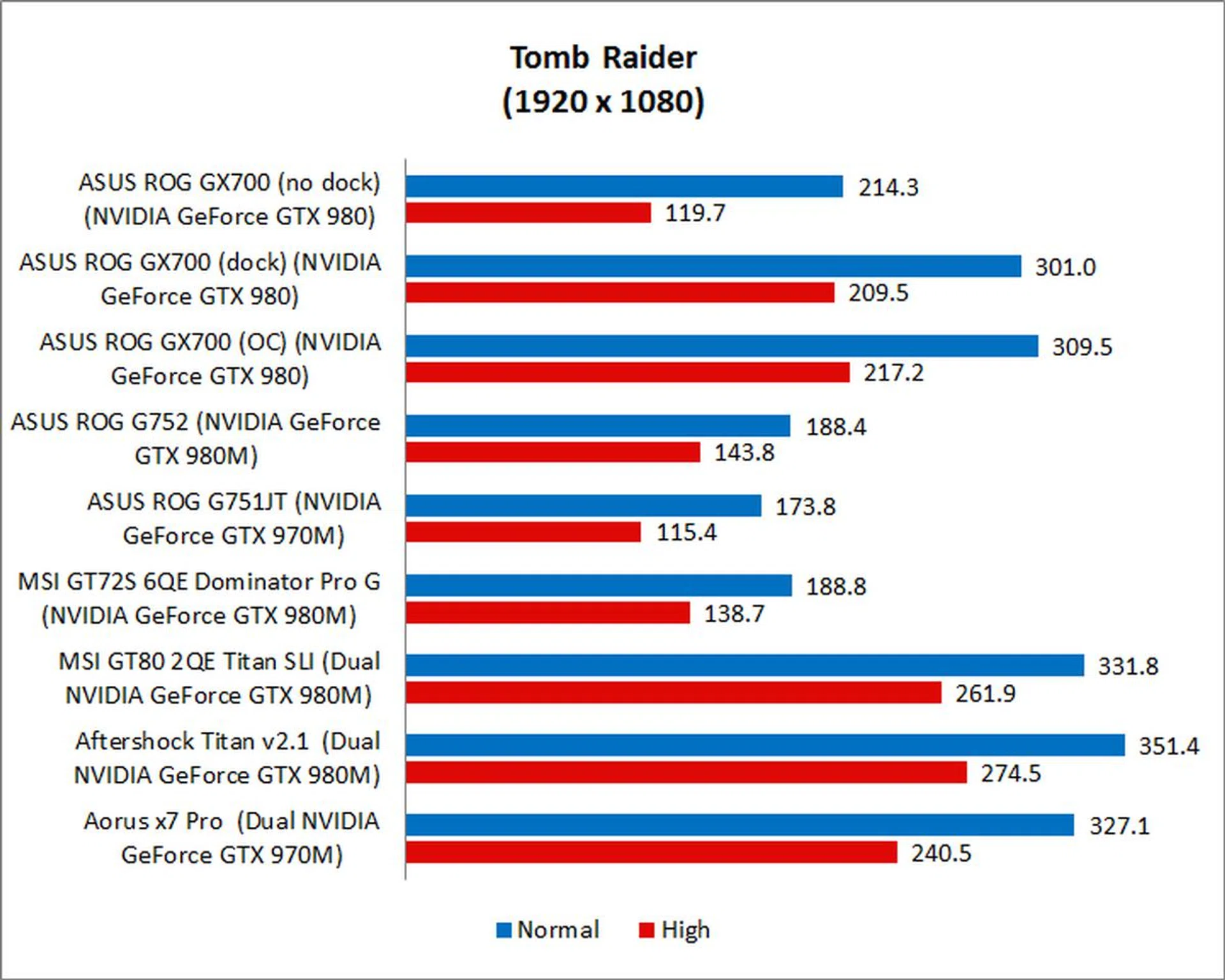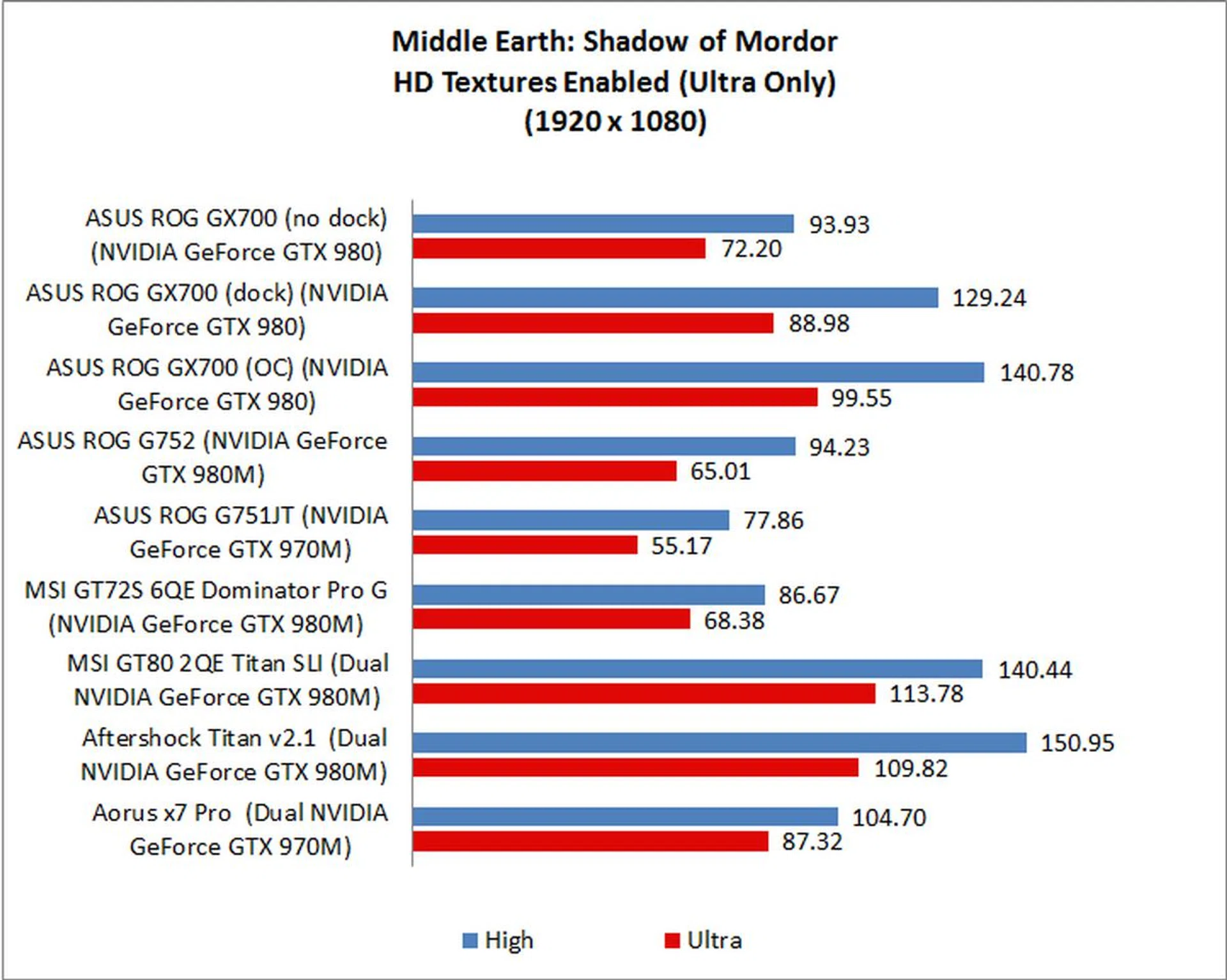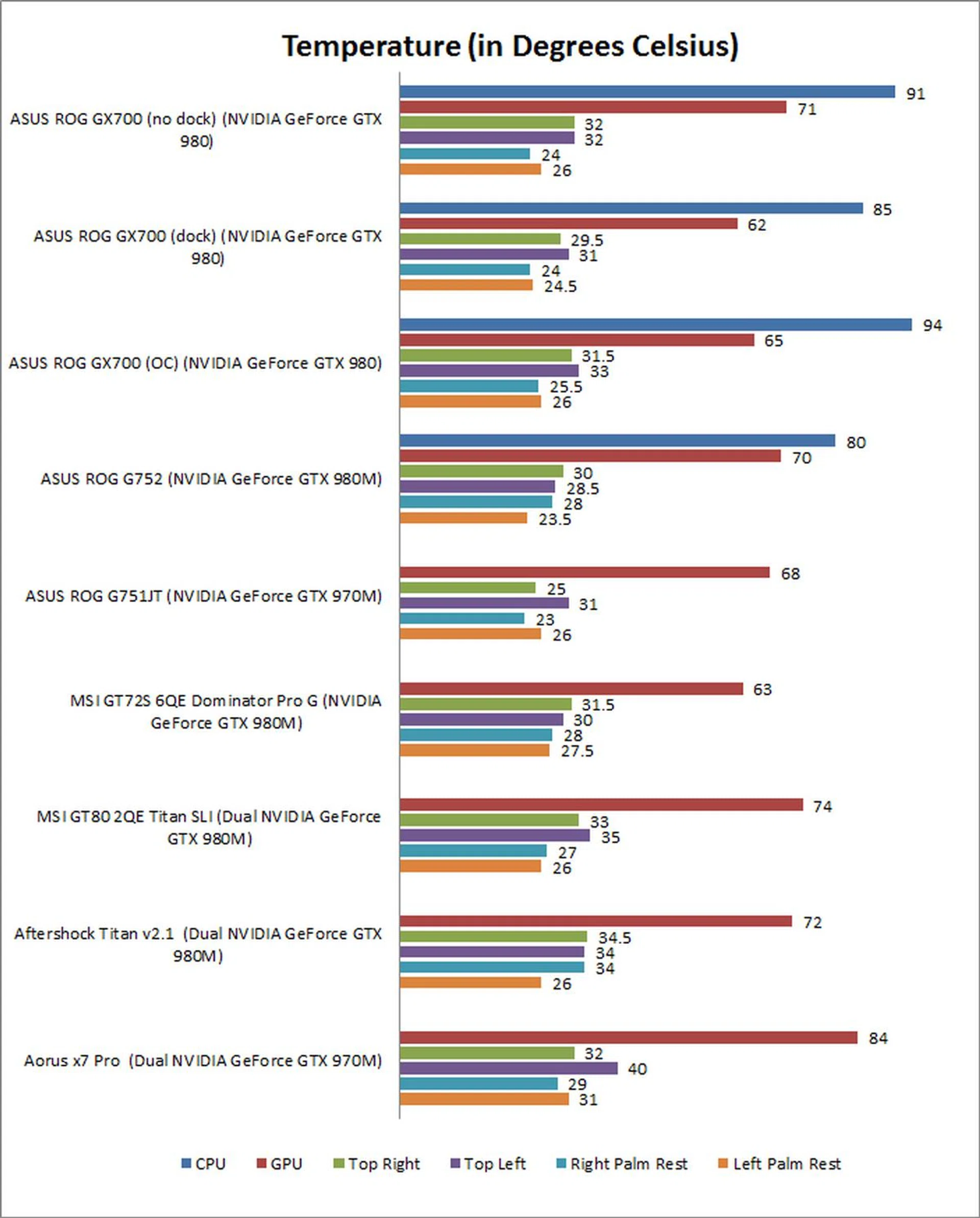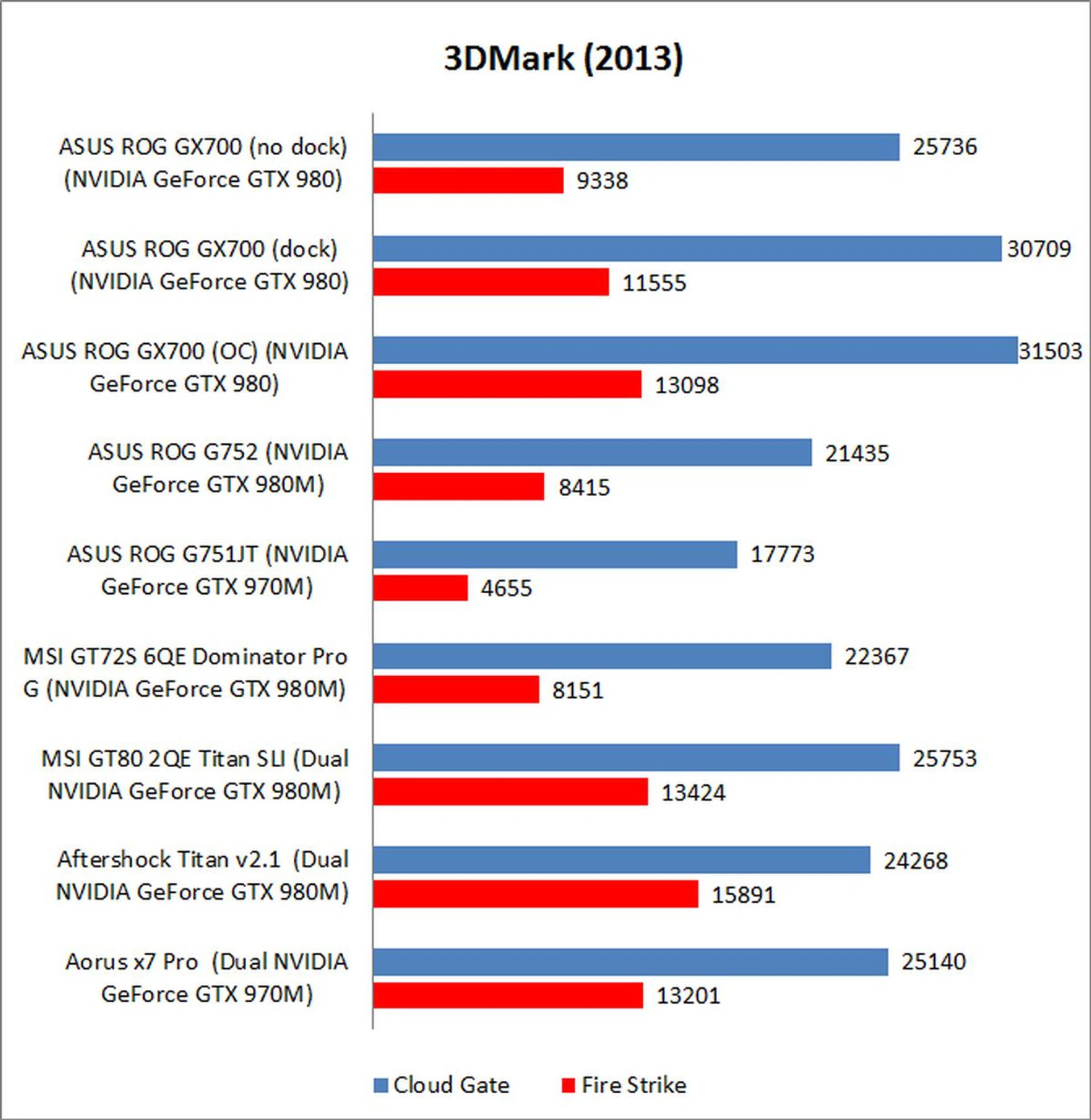 The GX700 still ended up behind the dual GeForce GTX980M notebooks, but the higher clock speeds did help to narrow the gap by quite a significant amount.