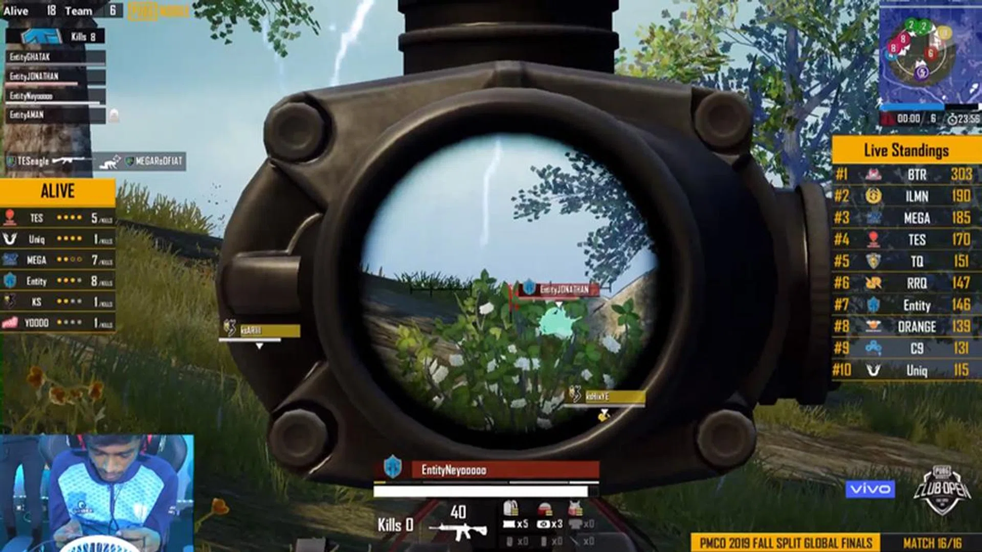 Match 14 was set in Erangel. In a massively ill-advised move, Entity Gaming’s Jonathan attempted to climb a wall while fighting off an opponent - but got shot down while doing it. We’ve all lost our head in the middle of a match though, it happens. Mega took down both Illuminate and Bigetron for the win here, bumping them up to second place in the standings with two chicken dinners.
