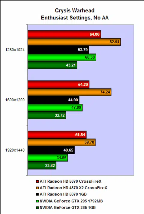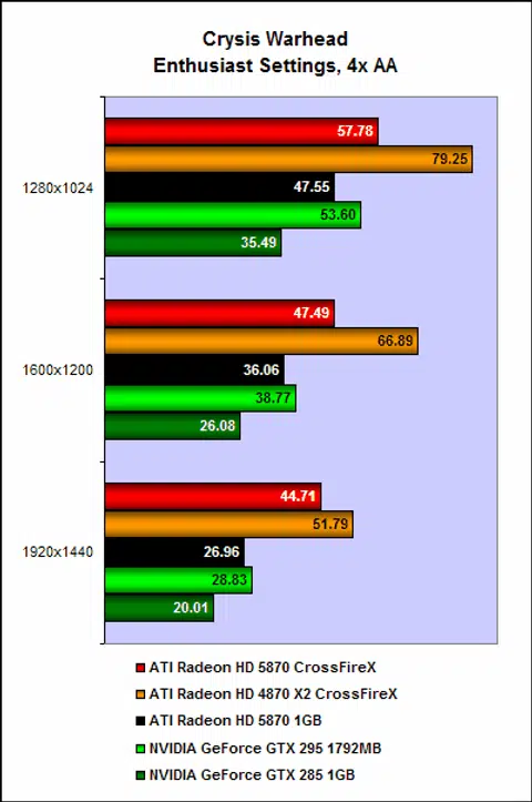 On Crysis Warhead, the pair of Radeon HD 4870 X2 cards was the best performer by far. Managing an incredible 51fps even on the the most demanding setting of 1920 x 1440 with 4x anti-aliasing enabled. But the pair of Radeon HD 5870 cards isn't far behind at all though. The superb performance of the HD 4870 X2 cards is most likely due to the fact that it has a whopping 4GB of frame buffer, as opposed to the HD 5870 cards combined frame buffer of 2GB. To give you some perspective of the matter at hand, a single Radon HD 4870 X2 is slower than a single GeForce GTX 295, so the only logical reason for the CrossFire pair of the 4870 X2 to fair better is more frame buffer in addition to four GPUs to pick up the slack.