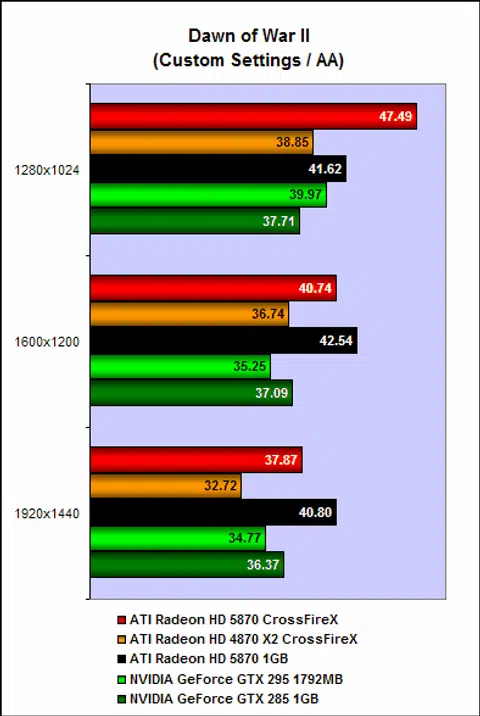 On Dawn of War 2, Warhammer 40,000 fans will find greater joy with a pair Radeon HD 5870 as it consistently outperforms the Radeon HD 4870 X2. In fact, on the X38 setup, a single HD 5870 recorded better results than the pair of HD 4870 X2. Our experiences with Dawn of War 2 tells us that the game has scaling issues and this is probably why the pair of HD 4870 X2 performed as they did. This serves to remind us that the benefits from CrossFireX don't always scale proportionately and much is dependent on both the game and driver optimization.
