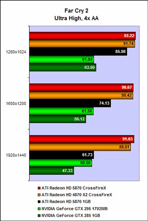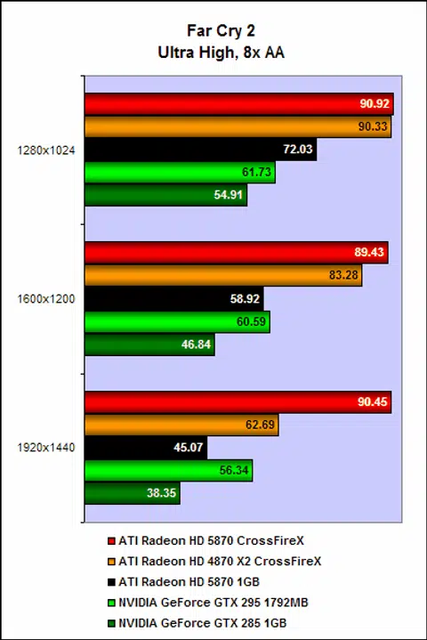 On Far Cry 2, the two sets of cards were again closely matched. Despite its larger framebuffer, we noted performance of the pair of Radeon HD 4870 X2 faded gradually as we upped the settings. Remember that the Radeon HD 5870 are running on new drivers, albeit in beta, and it is likely that these new drivers are more optimized for Far Cry 2, thus leading to what we see here.