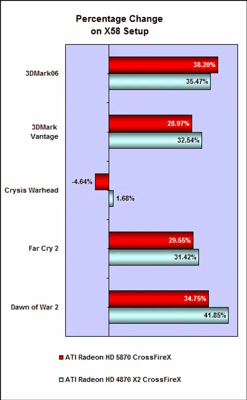 Interestingly, Anandtech did a comparison with on the Radeon HD 5870 in CrossFireX on both P55 and X58 to find out if there's any difference, and the tests suggest that while the X58 is noticeably quicker, the difference is only a paltry 2% to 7%. Where our tests are concerned using a different comparison scale of an X38 and X58 systems, we saw some huge gains on the X58 system especially on Far Cry 2 and Dawn of War 2. And as developers begin to optimize games for the new generation of Intel processors, we think that the older Core 2 processors will no longer be sufficient. If your intent is to get the upcoming Radeon HD 5870 X2, you'll definitely need an Intel X58 setup with a high speed Core i7 processor to stretch it to its limits.