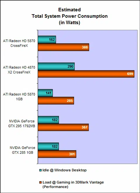 From our graphs, we can clearly see the monstrous power requirements of the Radeon HD 4870 X2 CrossFireX pair. Peaking at nearly 700W, its power requirement is nearly double that of the Radeon HD 5870 CrossFireX pair. Furthermore, when measuring the power draw of the Radeon HD 4870 X2 pair, we noticed that the power draw was prone to wild fluctuations, sometimes surging as high as 770-plus watts. A formidable PSU is a must for a HD 4870 X2 CrossFireX setup and thankfully such a requirement isn't necessary on the new Radeon HD 5870 cards.