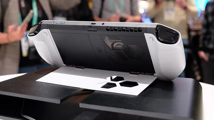 There's a built-in kickstand for when you want to detach the controllers and use the display as a standalone screen. You can also see here the exhaust vents at the top, and I could feel a constant stream of warm air coming out of it.