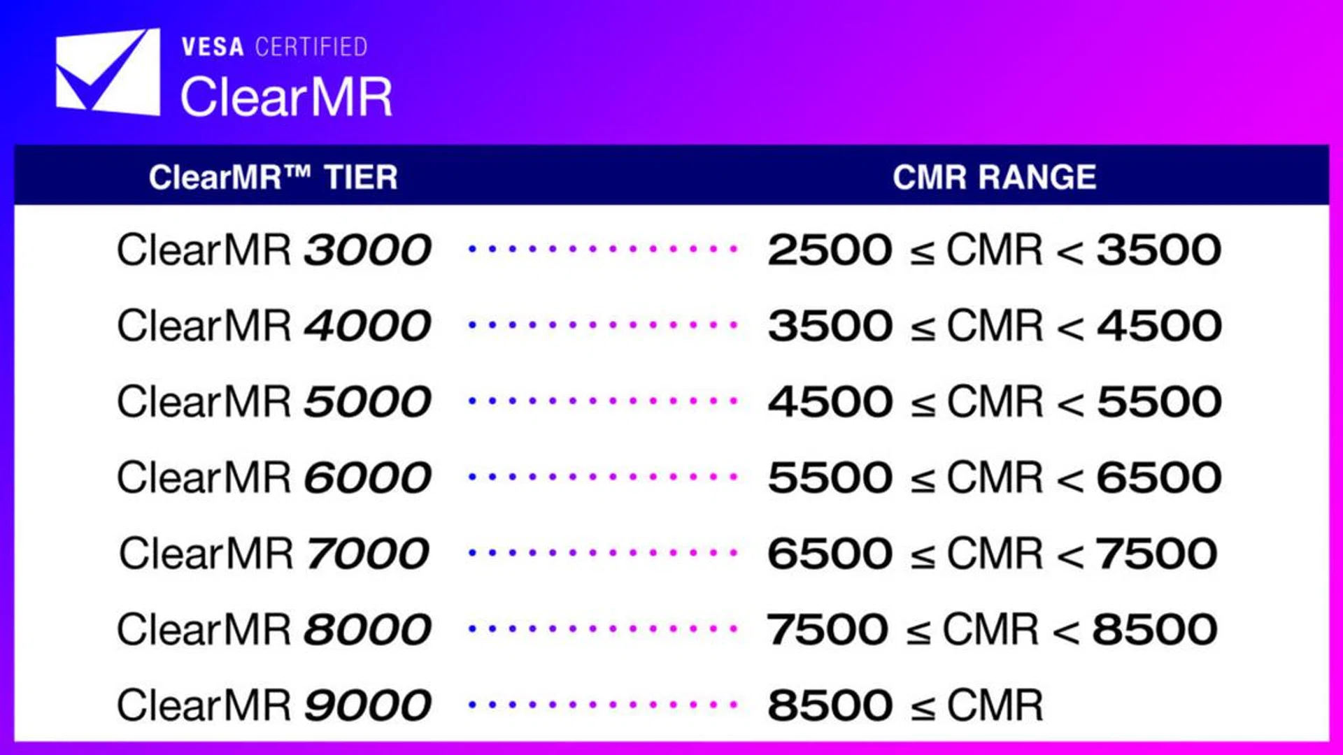 Introducing the Clear Motion Ratio Compliance Test Specification. Because it’s quite a mouthful, it’s also simply known as ClearMR. The new standard is accompanied by a logo program for consumer displays (from LED to OLED), ranging from PC monitors and TVs to notebooks and all the way down to tablets as well. Several products have already received certification under this program, and you can see if your display is certified via this link. ClearMR introduces a tiered system, assigning numerical values that reflect a display's ability to render clear versus blurry pixels during rapid movement. For instance, a ClearMR 7000 rating indicates a "Clear Motion Ratio" or CMR ranging from 6,500 to 7,500, suggesting the display has 65–75 times more clear pixels compared to blurry ones, providing consumers with a clearer understanding of a display's motion clarity capabilities.