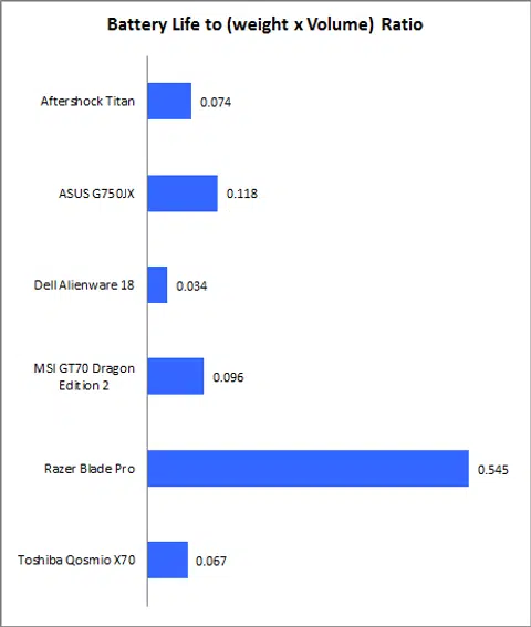 Expectedly, the Dell Alienware 18 scored the lowest - 0.034 - given its poor battery life and hulking dimensions and weight. At well over 5kg (perhaps even past 6kg if you consider its accompanying power brick), it feels significantly heavier than the other notebooks and is one that we would not recommend carrying around for any extended periods of time; in fact it's not even mobile friendly to consider moving it about. On the other end of the spectrum, with its slim dimensions and light weight (comparatively speaking), the Razer Blade Pro was unsurprisingly the most portable.