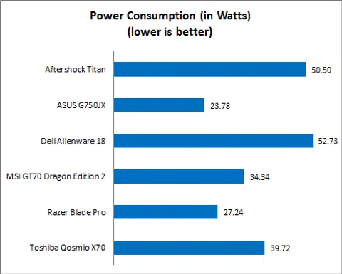 If we were to look at power consumption figures, which is a better representation of a system’s efficiency, we can see that the Qosmio’s figure of 39.72W is actually somewhat on the high side. The two dual-GPU monsters from Aftershock and Dell both exceeded 50W. We can also see that the ASUS’ low power consumption of just 23.78W helped contribute to its long battery life.