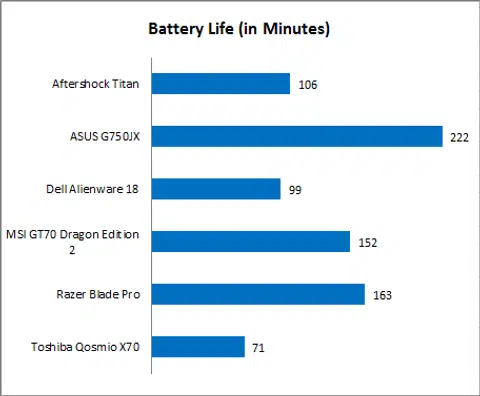 On the other end of spectrum, we have the Toshiba Qosmio X70 and Dell Alienware 18, which lasted 71 and 91 minutes respectively. However, the Qosmio X70 only lasted that long because of its puny battery which has a capacity of just 47Wh - the least by far.