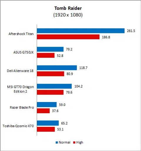 The Aftershock Titan was again the top performer on Tomb Raider, recording 261 fps on "Normal” and 186 fps on "High". With these high performance scores, you could easily run multi-monitor gaming off the Aftershock Titan in your home setup. The results were easily double that of the Alienware 18, which has the same dual GPU configuration as the Titan. Evidently, the Alienware 18’s SLI configuration is not as efficient and effective in Dell's implementation.