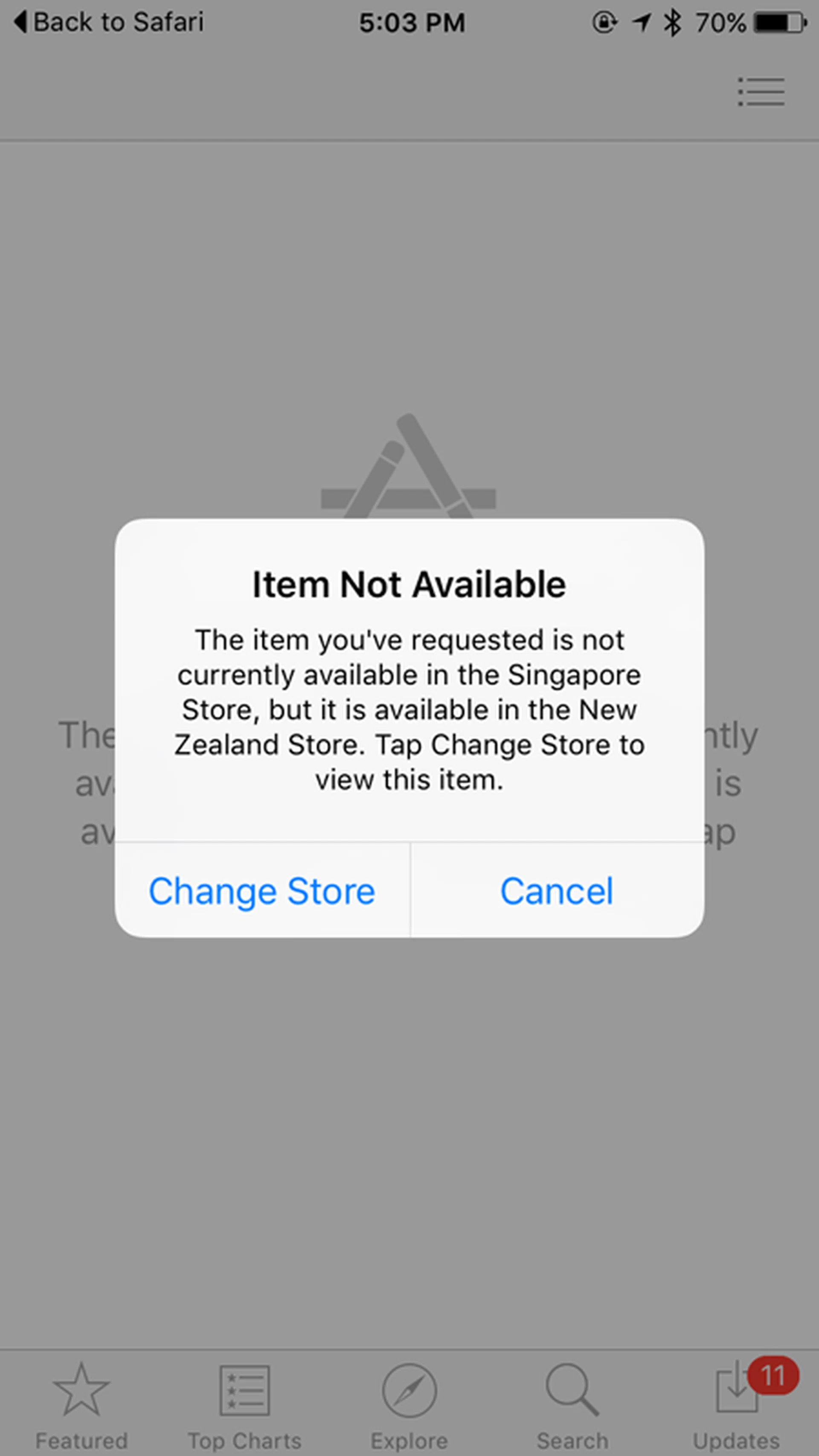 2. Click on this link or if you're not viewing this on mobile, open Safari on your iPhone and search for "Pokemon Go app store" and click the link that will take you to the Pokémon GO app in the App Store. You should see a pop up saying that this app is not available in Singapore, but is available in New Zealand. Click Change Store to go the New Zealand App Store.