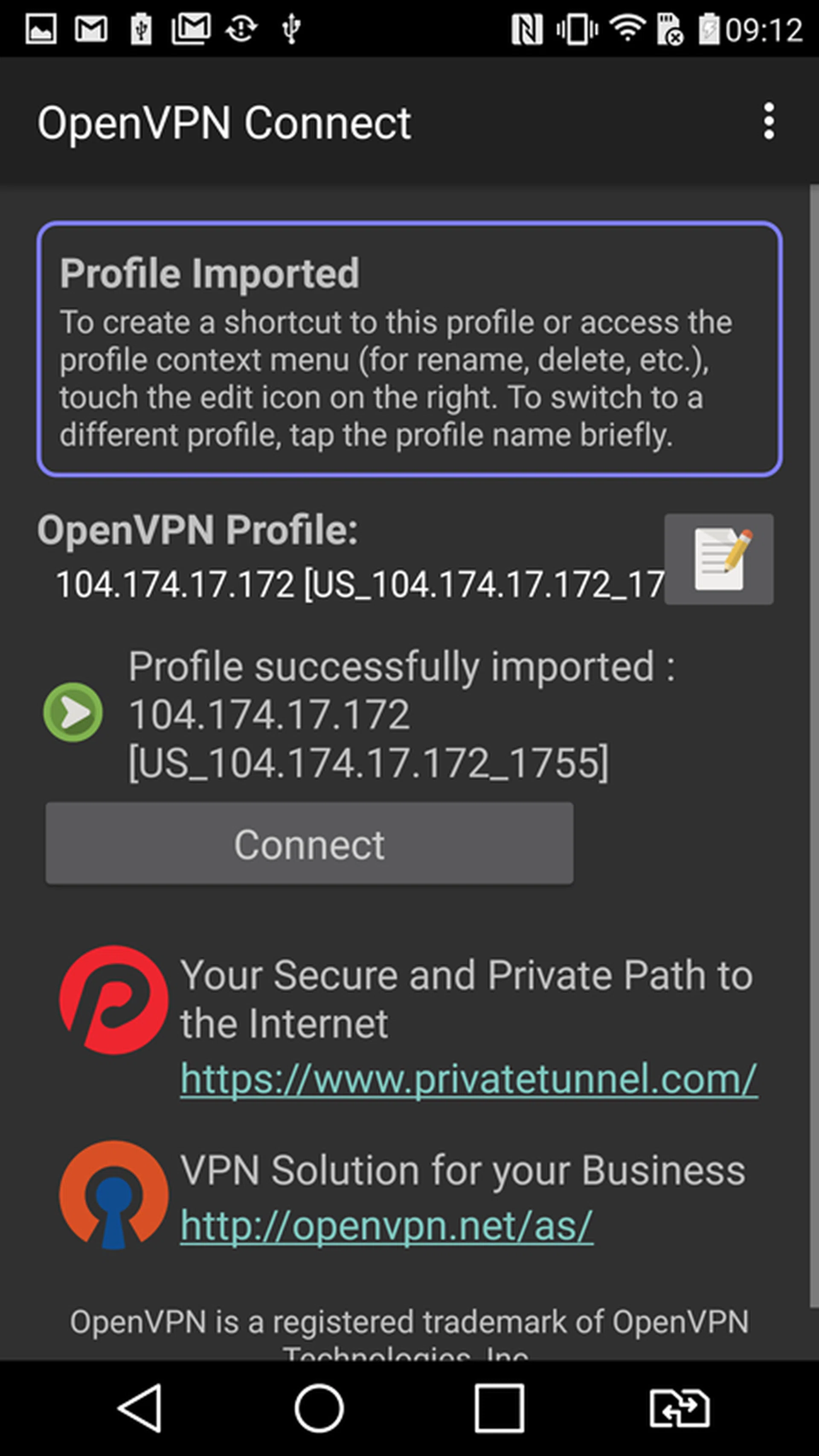 3. The selected VPN profile uses Autologin, so just tap on the Accept button to import the profile. After the profile is imported, press Connect to establish the connection.