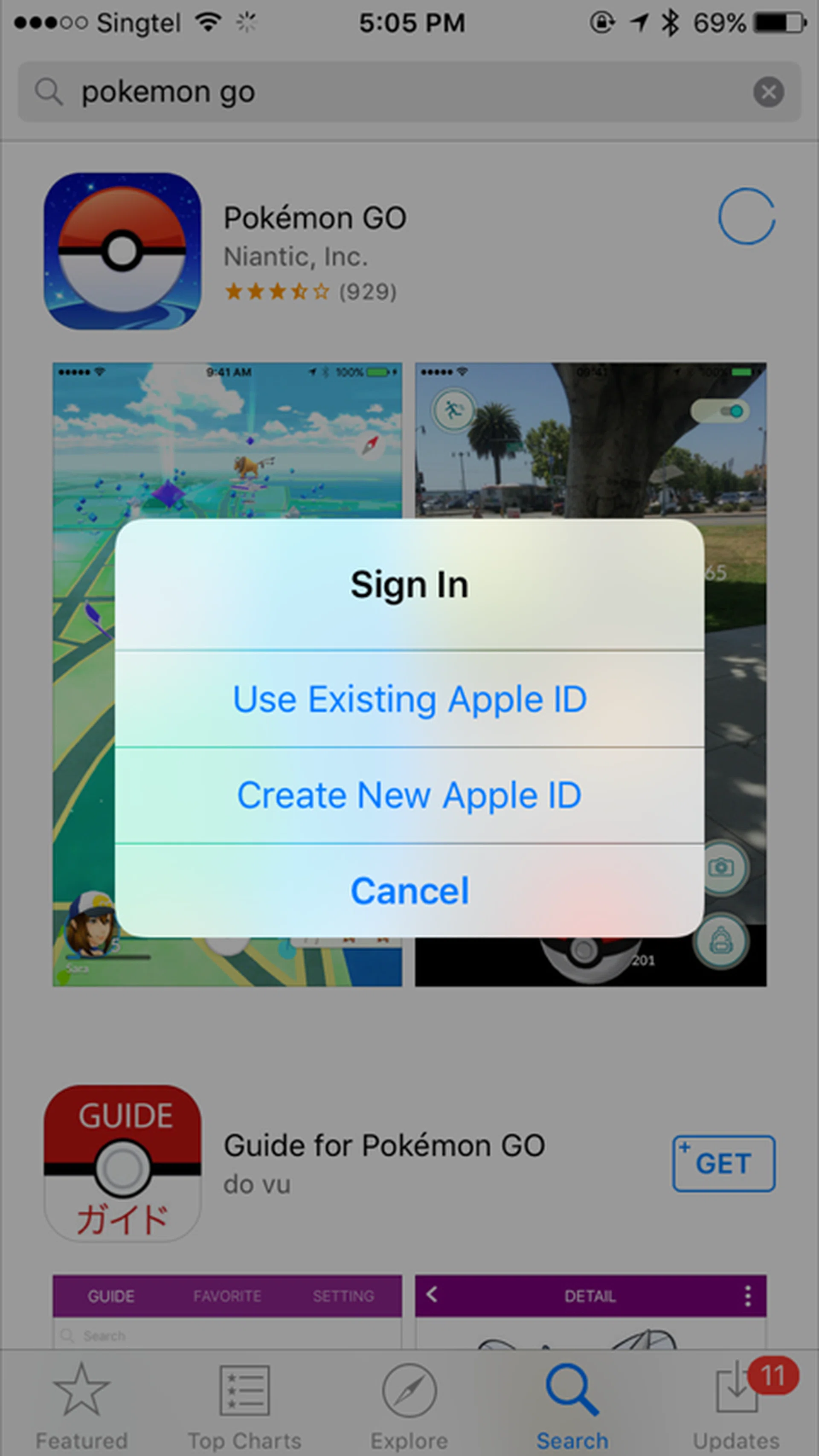 3. You may have to search for Pokémon GO again. Do so and you should see it. Click Get and it will prompt you to Sign In with an existing Apple ID or to Create a new Apple ID.