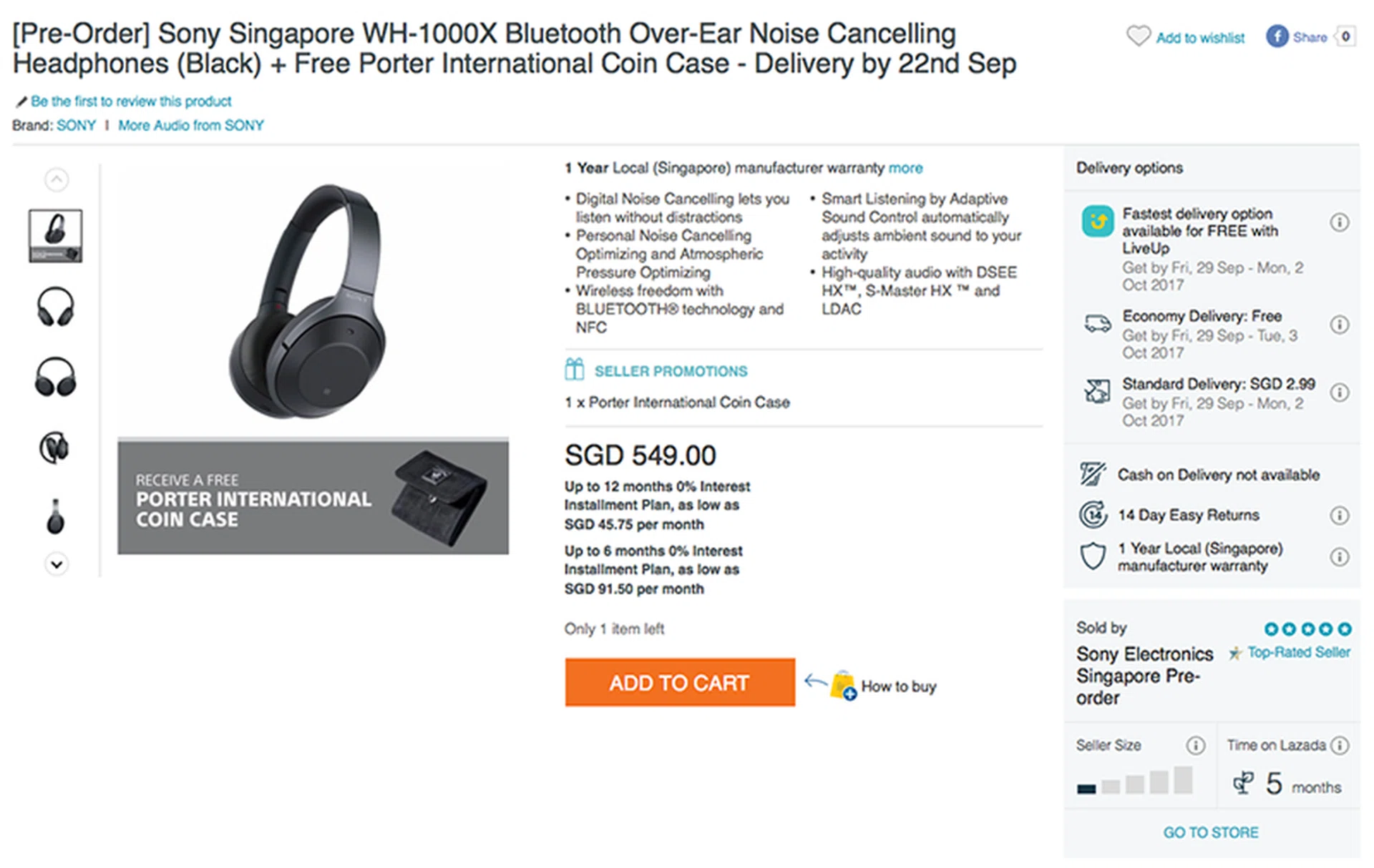 Sony's new WH-1000X Bluetooth noise canceling headphones can now be controlled using an app on your favorite iOS or Android device and features new Atmospheric Pressure Optimizing technology, which compensates for changes in cabin pressure, ensuring optimum sound quality regardless of your altitude. It is available for pre-order on Lazada through Sony Singapore and will be delivered to you by 22nd September. Unfortunately, since the WH-1000X headphones are so new, there isn't a price discount. But, every order does come with a free Porter International coin case. The Sony WH-1000X is priced at S$549.