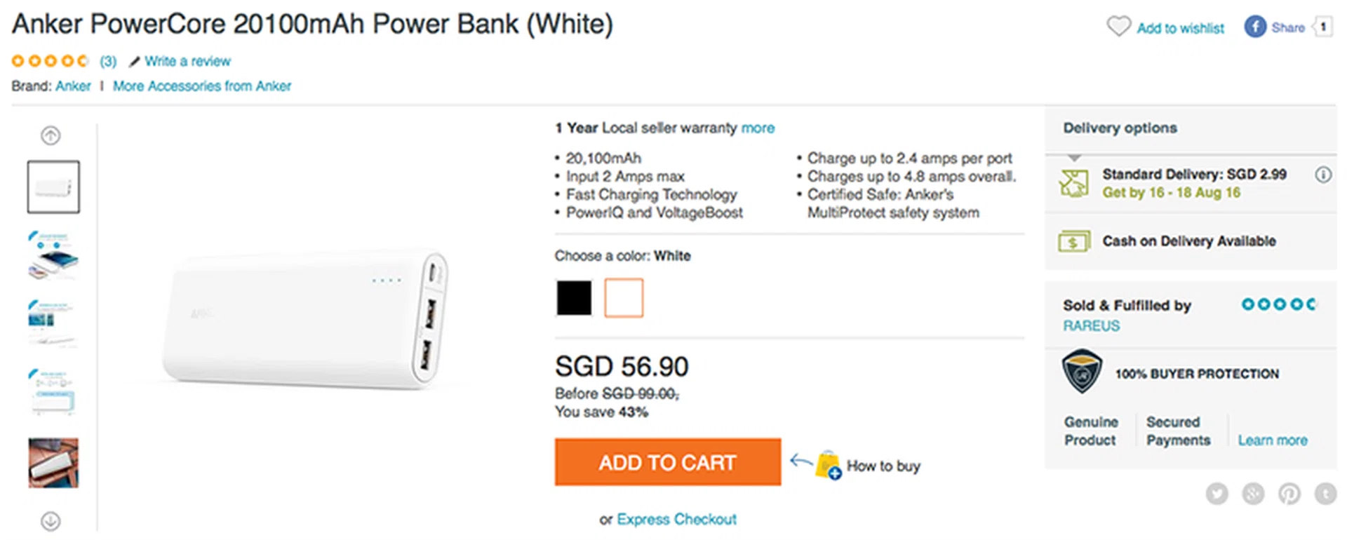 If you are heading out to catch Pokémons, you definitely need a mobile power bank. One of the best you can find is this Anker PowerCore in white. It has a capacity of a whopping 20,100mAh, which should be enough to charge most smartphones 4 to 5 times over. It also features dual USB ports for charging, so if you out catching Pokémons with a friend, you can charge your phones together. It is available from Lazada at S$56.90, which represents savings of over 40%.