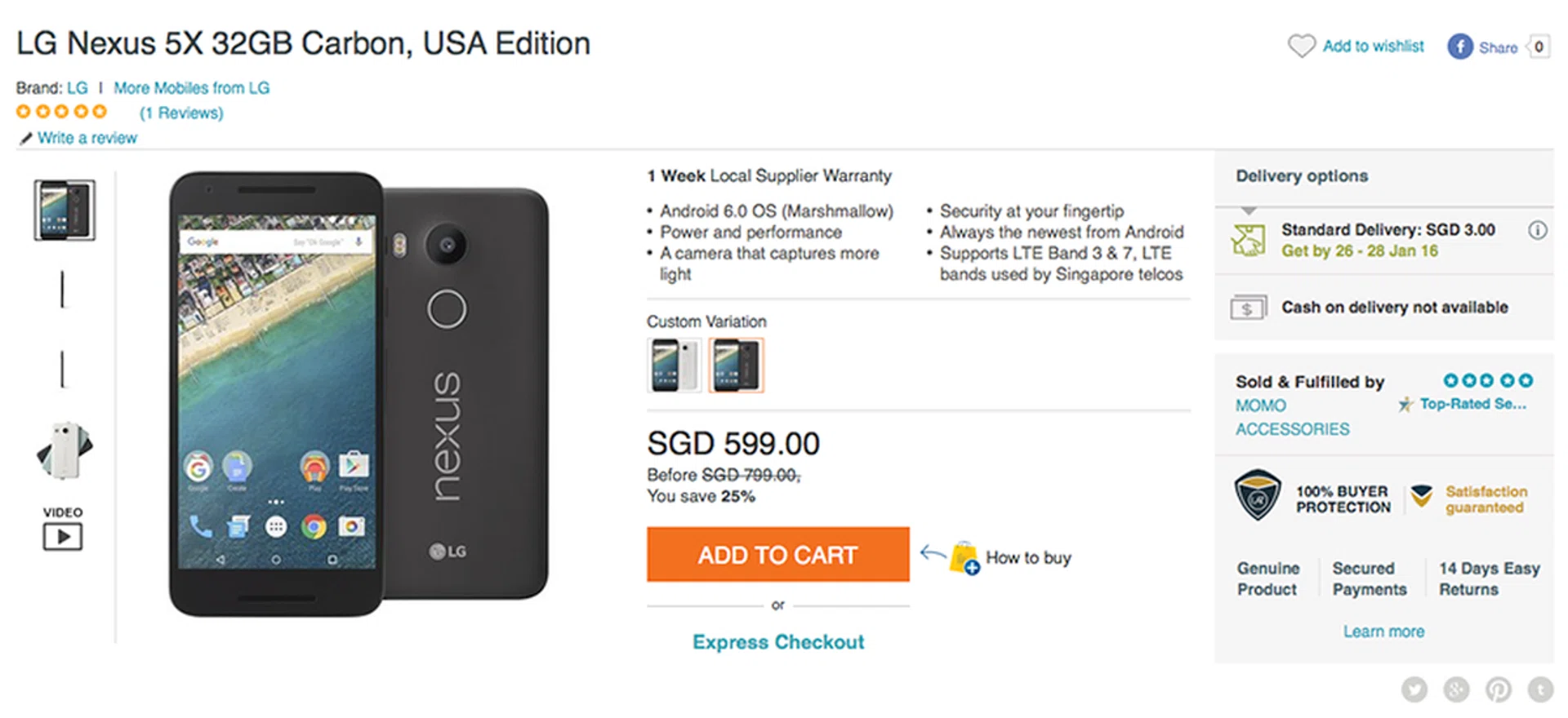 Launched last October, the LG Nexus 5X is a 5.2-inch smartphone with a screen resolution of 1920 x 1080 pixels (Full HD) and a pixel density count of 423 ppi. It uses a 64-bit 1.8GHz Qualcomm Snapdragon 808 hexa-core processor (same as the LG G4 smartphone), paired with an Adreno 418 GPU for graphics, all complemented by 2GB RAM. It also has a 12.3 megapixel ƒ2.0 dual-LED rear-facing camera that can also record videos in 4K. Lazada is now offering the 32GB for S$599, which represents remarkable savings.