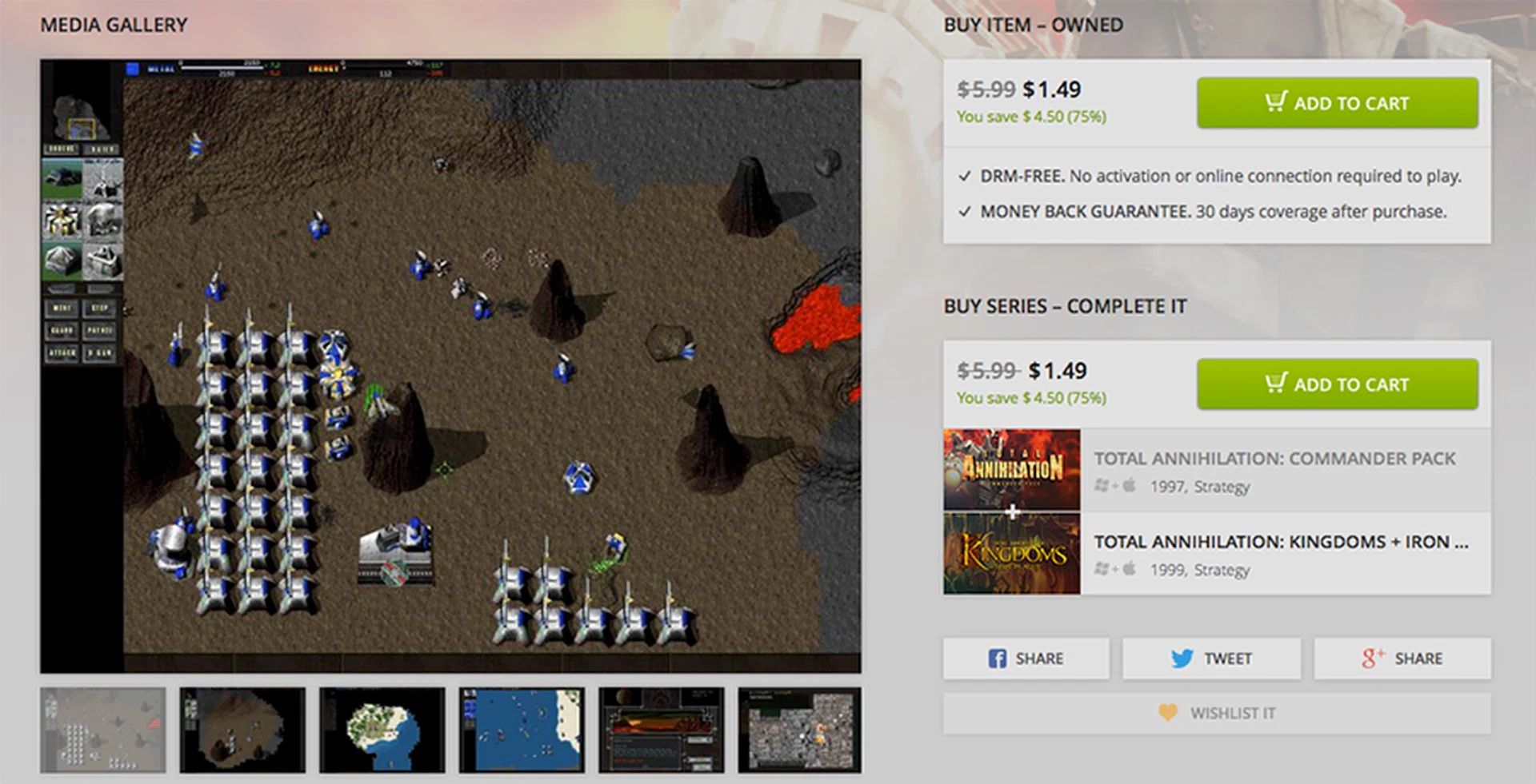 Released in 1997, Total Annihilation was one of the stand-out real-time strategy games of its time and a classic of the genre. It was the first real-time strategy to feature 3D units and terrain, and this gave a whole new spin to the genre as players needed to seriously consider aspects such as elevation and line of sight. The game also enjoyed a large and active modding community where members created tons of custom units for the game, which added to its already fantastic replay value and longevity. Get Total Annihilation now, including the two expansion packs The Core Contingency and Battle Tactics, for just US$1.49. It’s available for both PC and Mac.