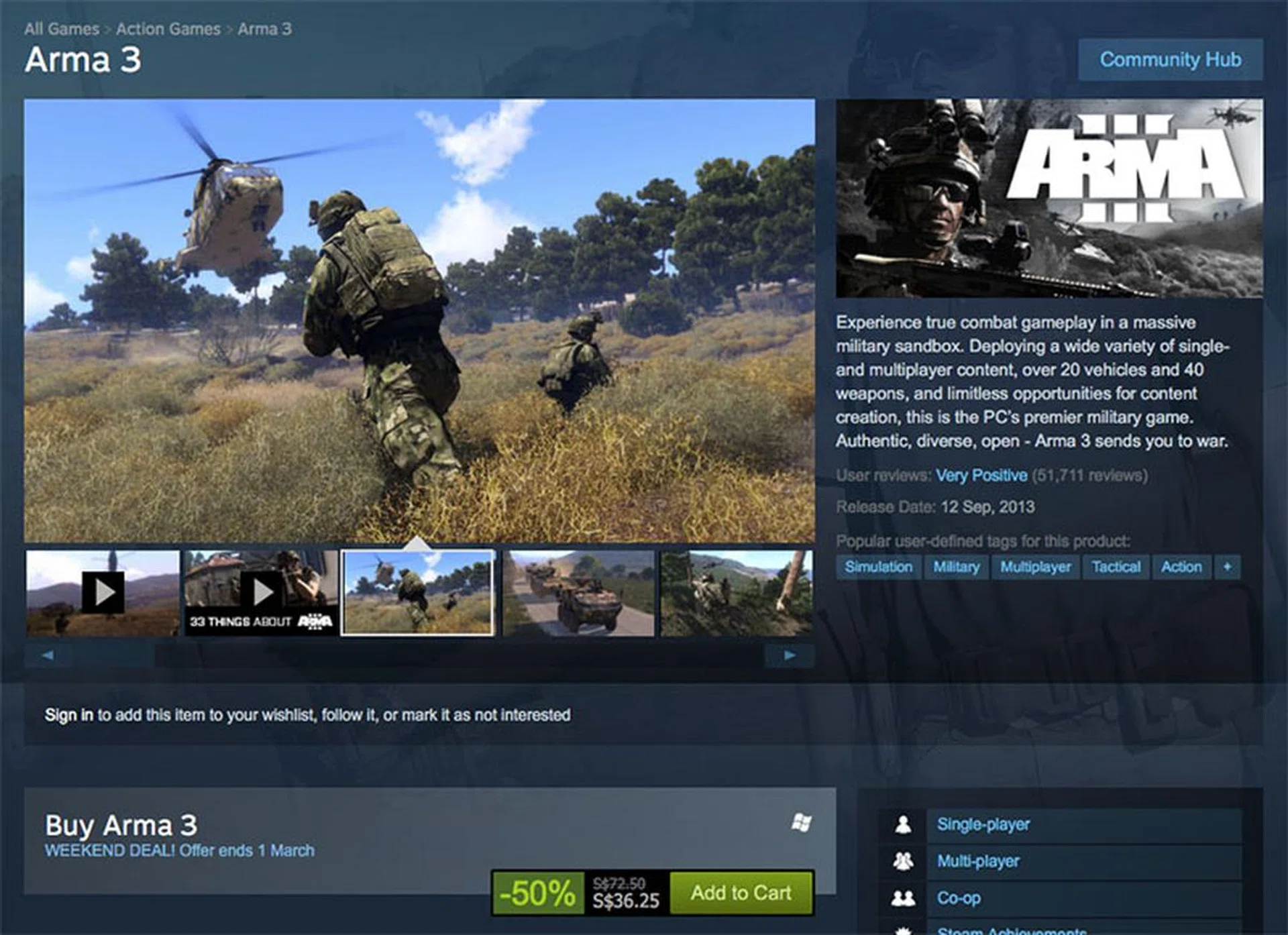 If Black Ops III feels too “arcadey” for you, there’s Arma 3. Voted the best simulation in the year it was released, Arma 3 takes a completely different approach to warfare as compared to Black Ops III. Realism takes centerstage, and the game features photo-realistic terrain and environments that players can use to their advantage. In fact, some maps are so huge that they cover the equivalent of 270 kilometers. If you want a taste of warfare, Arma 3 is available on Steam for S$36.25 (50% off).