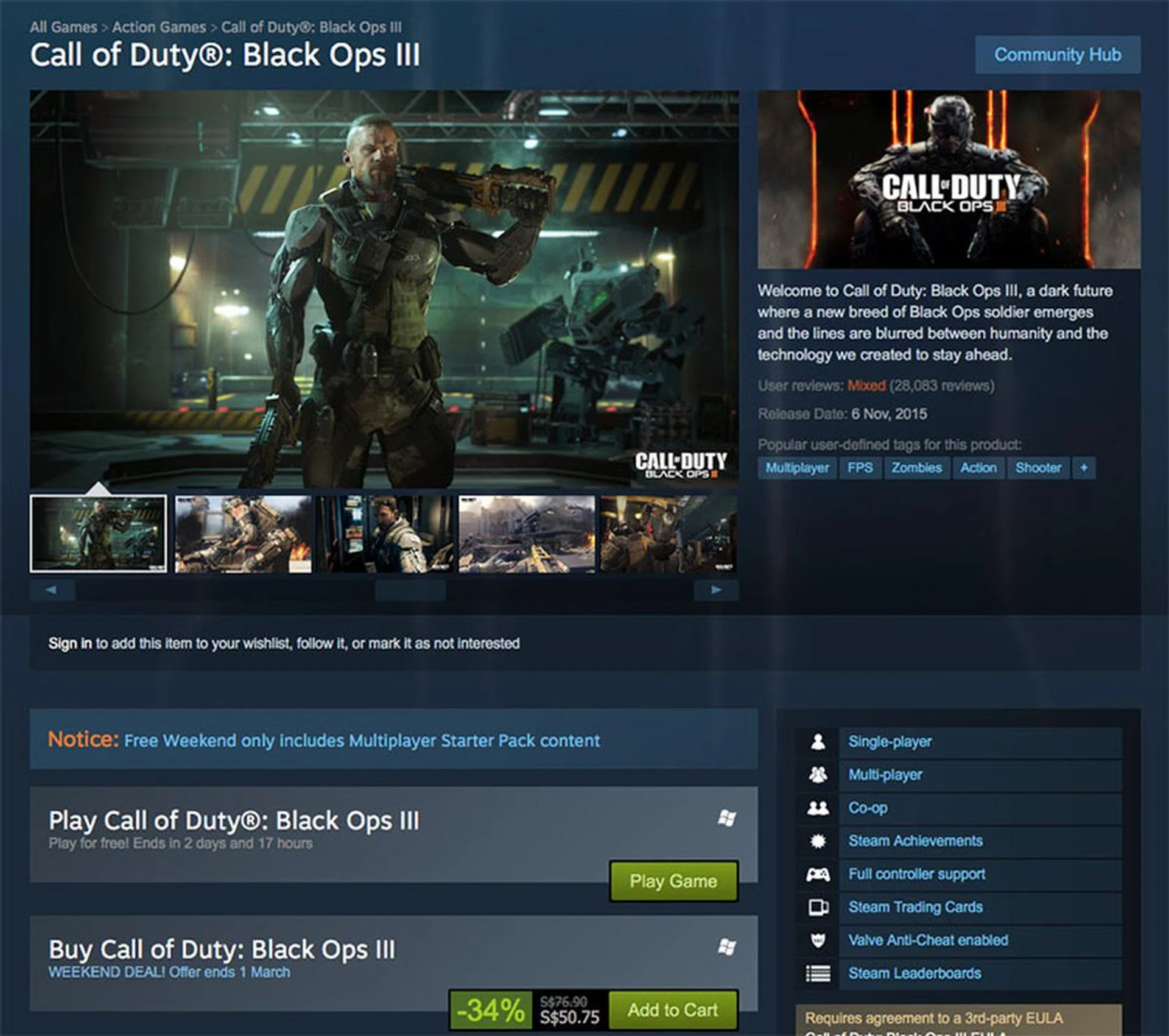 Call of Duty isn’t the world’s most popular FPS for no reason. In Call of Duty: Black Ops III, you play as a robotically-enhanced super soldier tasked to go deep behind enemy lines. The campaign is typical Call of Duty stuff, meaning to say that it doesn’t deviate greatly from past Call of Duty games. However, where the fun is really at is its excellent multiplayer mode. New weapons and scorestreaks aside, Black Ops III also sees the introduction of Specialists, which gives players unique abilities that can be triggered during battles. Best of all, Black Ops III is free to play this weekend, and if you find it fun, you can get it for S$50.75, which represents a discount of 34%.