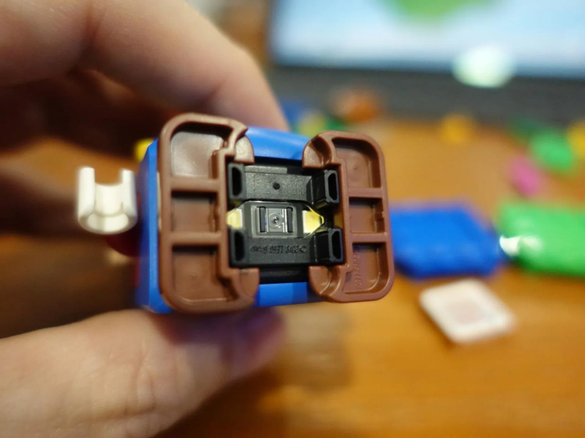 The sensor also reads the colour of the LEGO piece Mario is standing on, and this is what determines which environment Mario is in. So, if Mario is standing on blue pieces, then his small chest screen will show water and the water sound effect from the NES game will play as if he is swimming. Equally, if he is standing on red LEGO bricks for example, then that represents lava and standing too long on them will cause Mario to let out an audible perish and it will be game over until the next run begins.