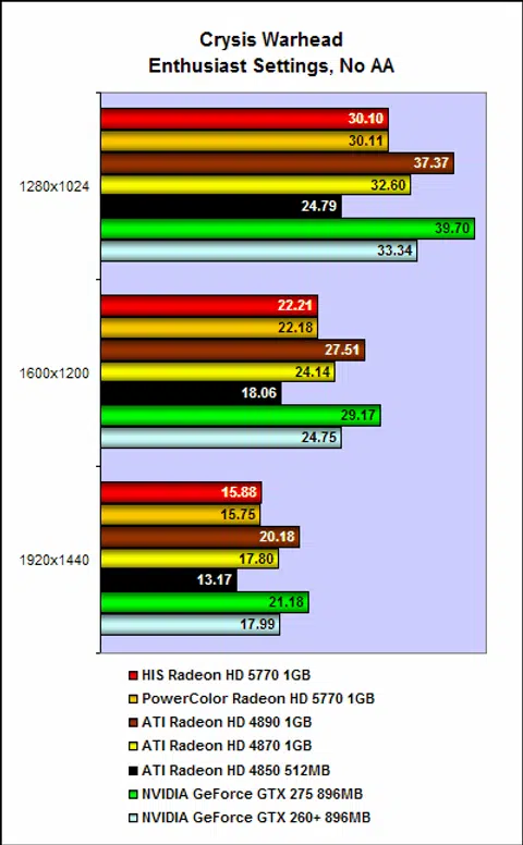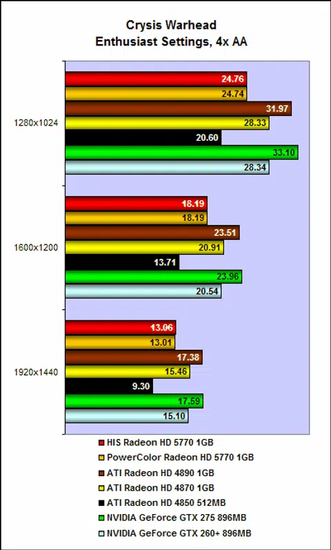 Hoping that the Radeon HD 5770 would redeem itself on real world gaming applications, we move on to Crysis Warhead. Again, the Radeon HD 5770 was a little underwhelming. We can see from the graphs distinctly, that it was it is a notch slower than the Radeon HD 4870 1GB editions, which denote the impact of the reduced memory bandwidth.