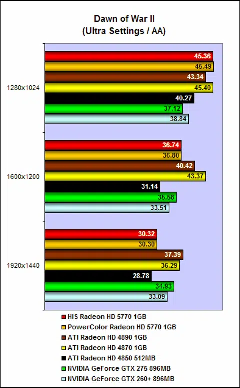 The two Radeon HD 5770 cards began brightly on Dawn of War 2, holding its own against the Radeon HD 4870 while outperforming the Radeon HD 4890 and even both NVIDIA cards. However, its performance dipped considerably as we increased the resolution - again a trait related to its limited memory bandwidth. At the highest resolution of 1920 x 1440, we noticed that the Radeon HD 5770 was only slightly faster than a Radeon HD 4850.