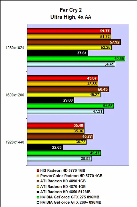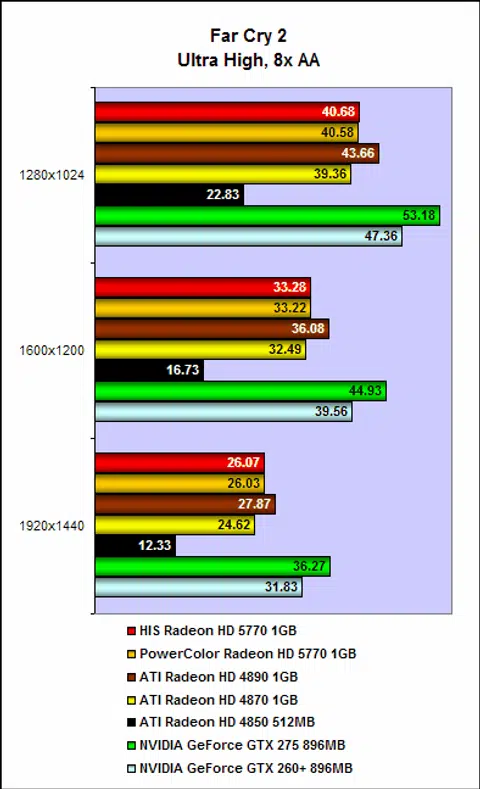 On Far Cry 2, the Radeon HD 5770 was just about as quick as the Radeon HD 4870, with both the newcomers recording results that were nearly identical to those achieved by the Radeon HD 4870.
