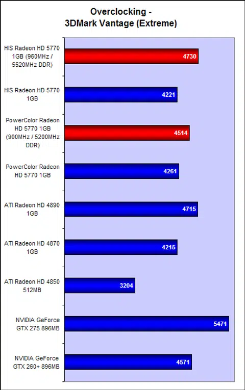 On the HIS Radeon HD 5770, however, we managed to achieve 960MHz at the core (the highest ATI Overdrive would allow us) and a stratospheric 5520MHz DDR at the memory. On the Extreme preset, this gave us 4730 3DMarks, representing a remarkable 12% improvement in performance, on par with the Radeon HD 4890.