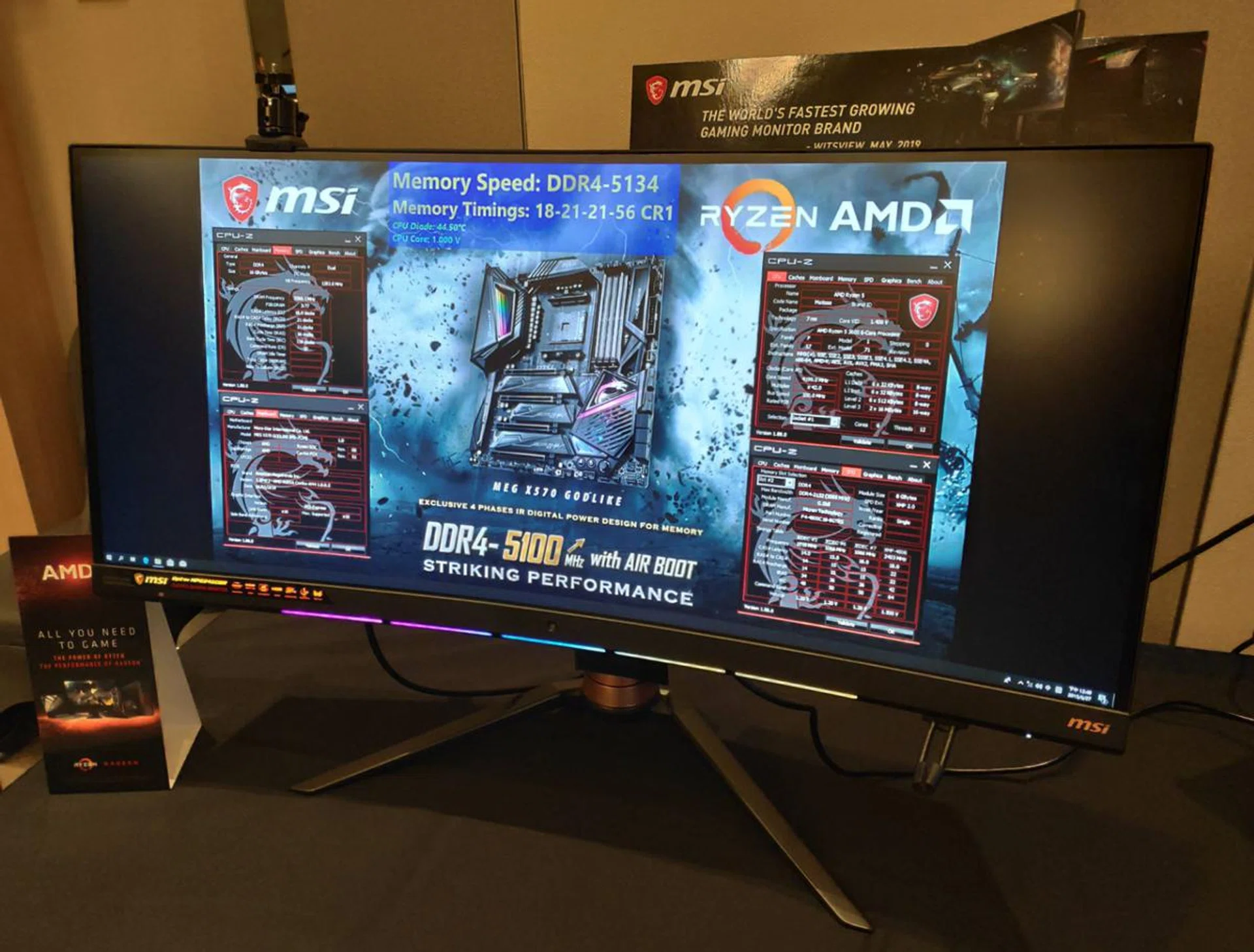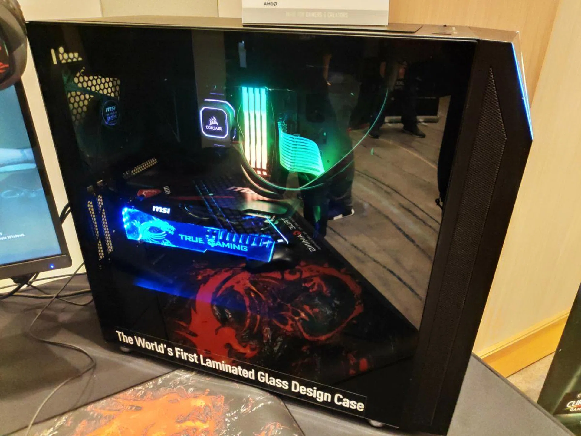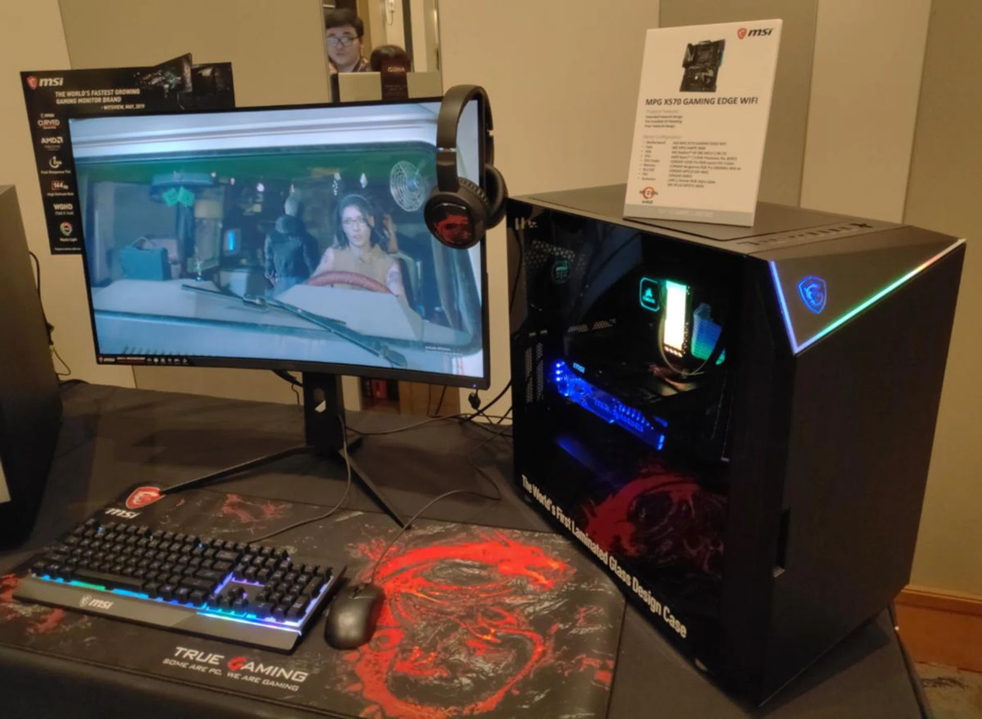 Hooked up to the monitors were a handful of gaming desktops, each equipped with one of the new X570 boards and various other MSI components as an ecosystem showcase. These included RGB memory modules and power supplies, complemented by the ones that were already gently strobing on the cases.