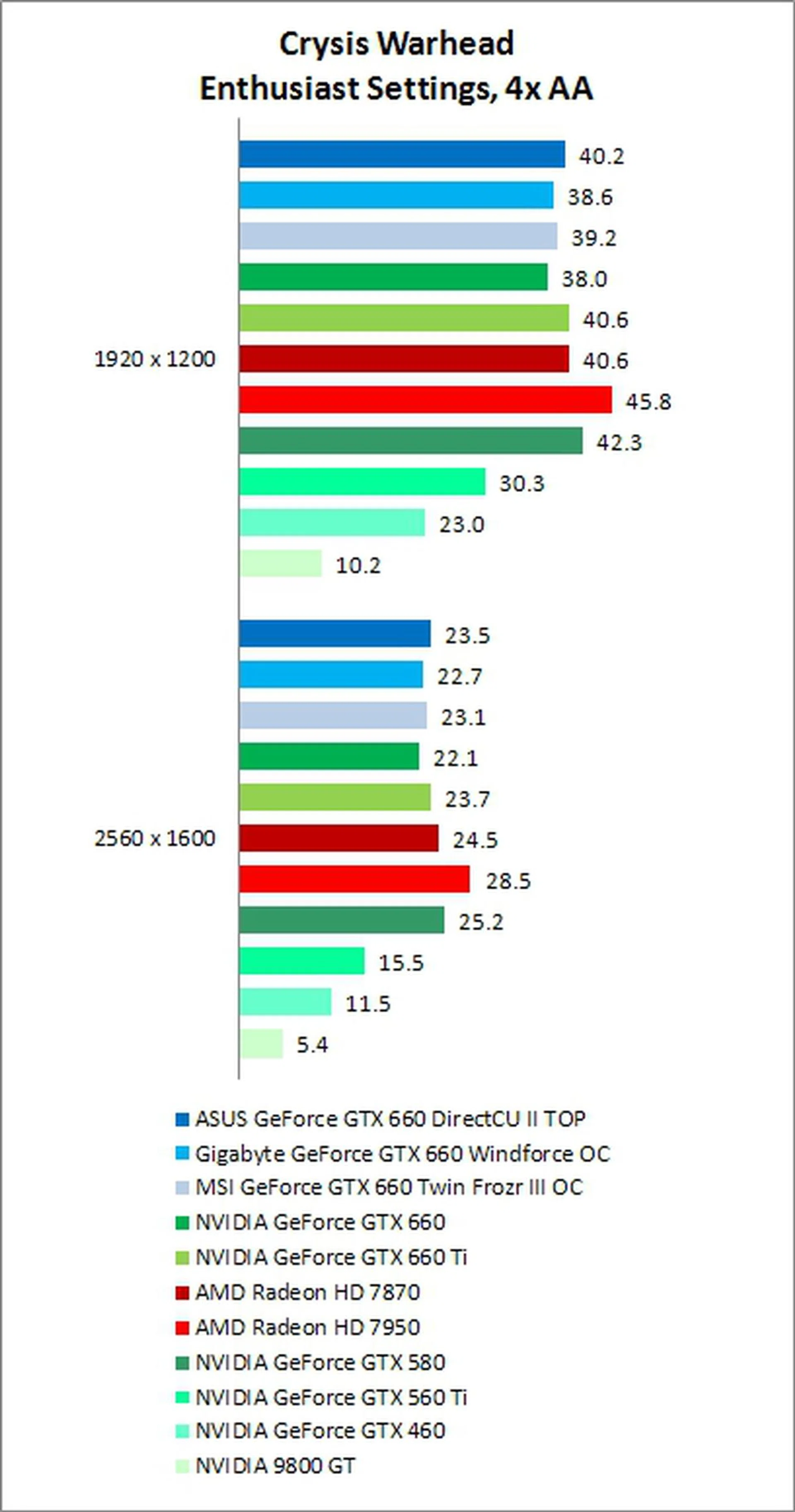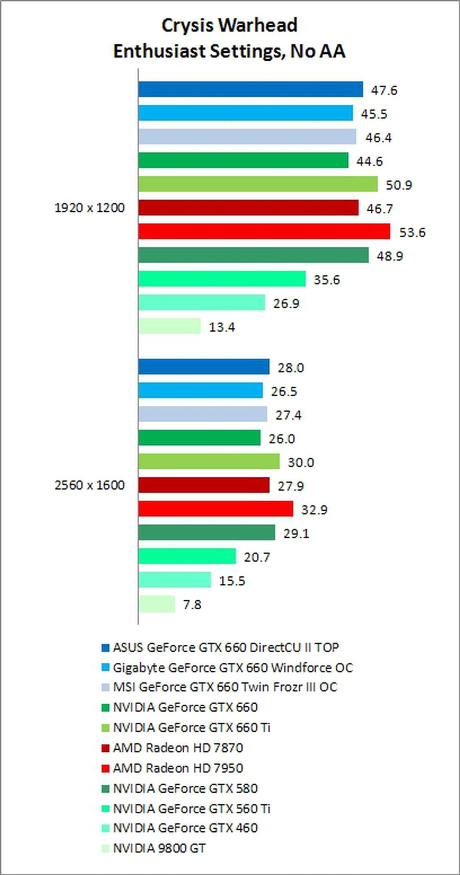 Crysis Warhead is one of the more taxing DX10 engine games out there, as it features a fairly heavy amount of tessellation. As was the case with Unigine 2.1, the GTX 660 once again struggled and fell behind the AMD Radeon HD 7870 due to this, although the difference wasn't that large, with only about 5-6% between them.