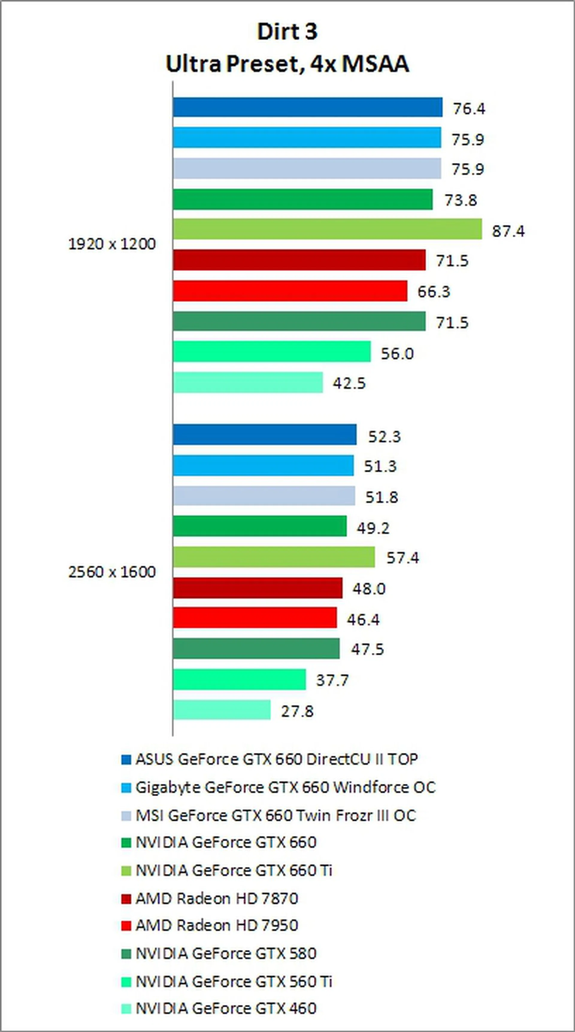 The GTX 660 put in another solid performance in Dirt 3, again beating both AMD cards, outscoring the HD 7870 by about 2%. Again, the disparity witnessed here between the two AMD cards is due to the improved frame rates that the Radeon HD 7870 churned out after we updated its graphics drivers to the latest version (Catalyst 12.8). We do expect to use similar improvements to the AMD Radeon HD 7900 cards with the new AMD Catalyst drivers, pending our updated test results. Our custom GeForce GTX 660 cards also performed better, with ASUS outscoring the reference design by 3% at 1920 x 1200, and 6% at 2560 x 1600. There wasn't anything to separate Gigabyte and MSI, with both about 0.5% behind ASUS at both resolutions.