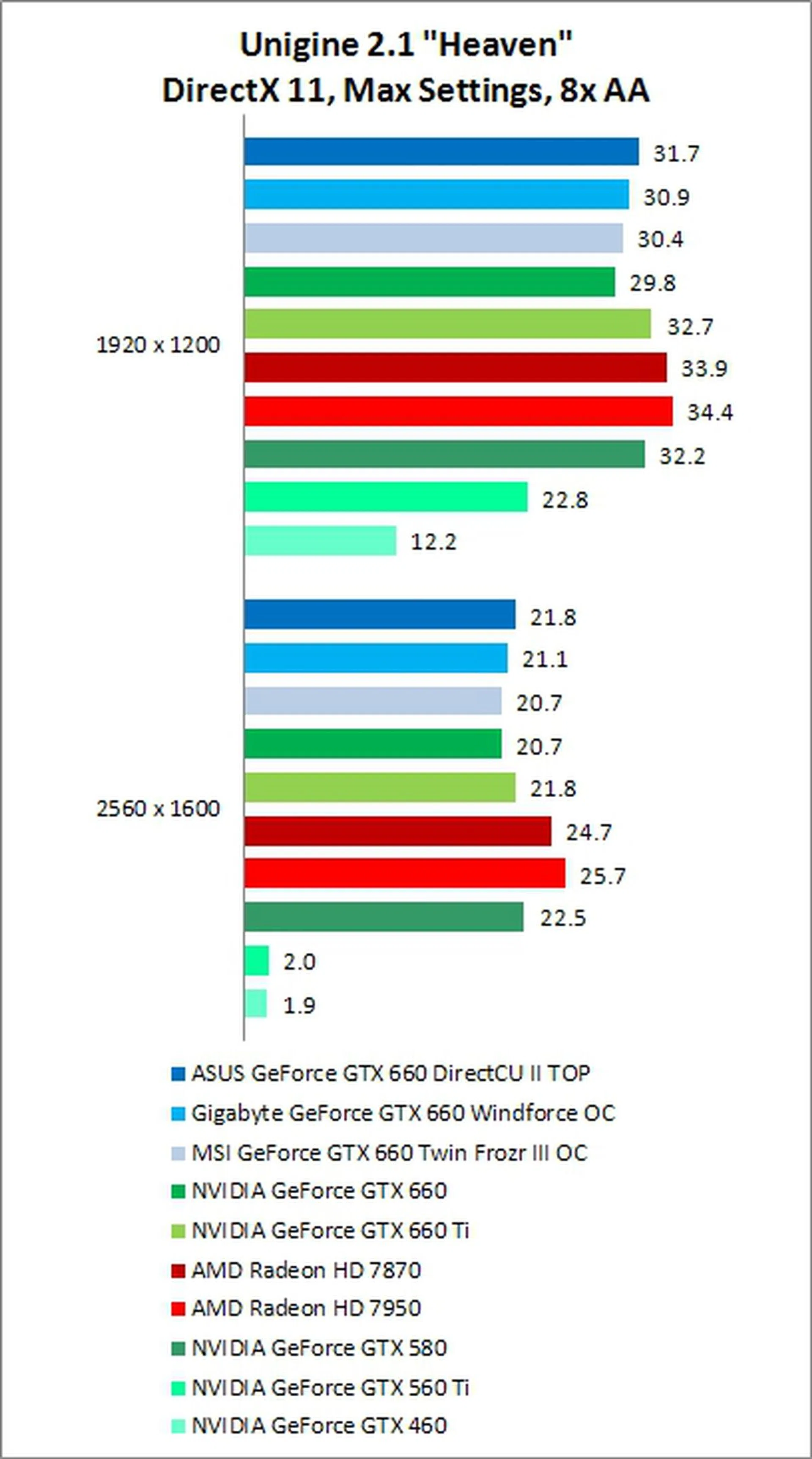 On the synthetic Unigine 2.1 benchmark, the GTX 660 struggled slightly, and was outperformed by the AMD Radeon HD 7870 by between 6-20%. This wasn't entirely unexpected, due to the lower number of stream processing units (CUDA Cores) on the GTX 660 being insufficient at handling the amount of advanced ambient occlusion and tessellation occurring in this test.