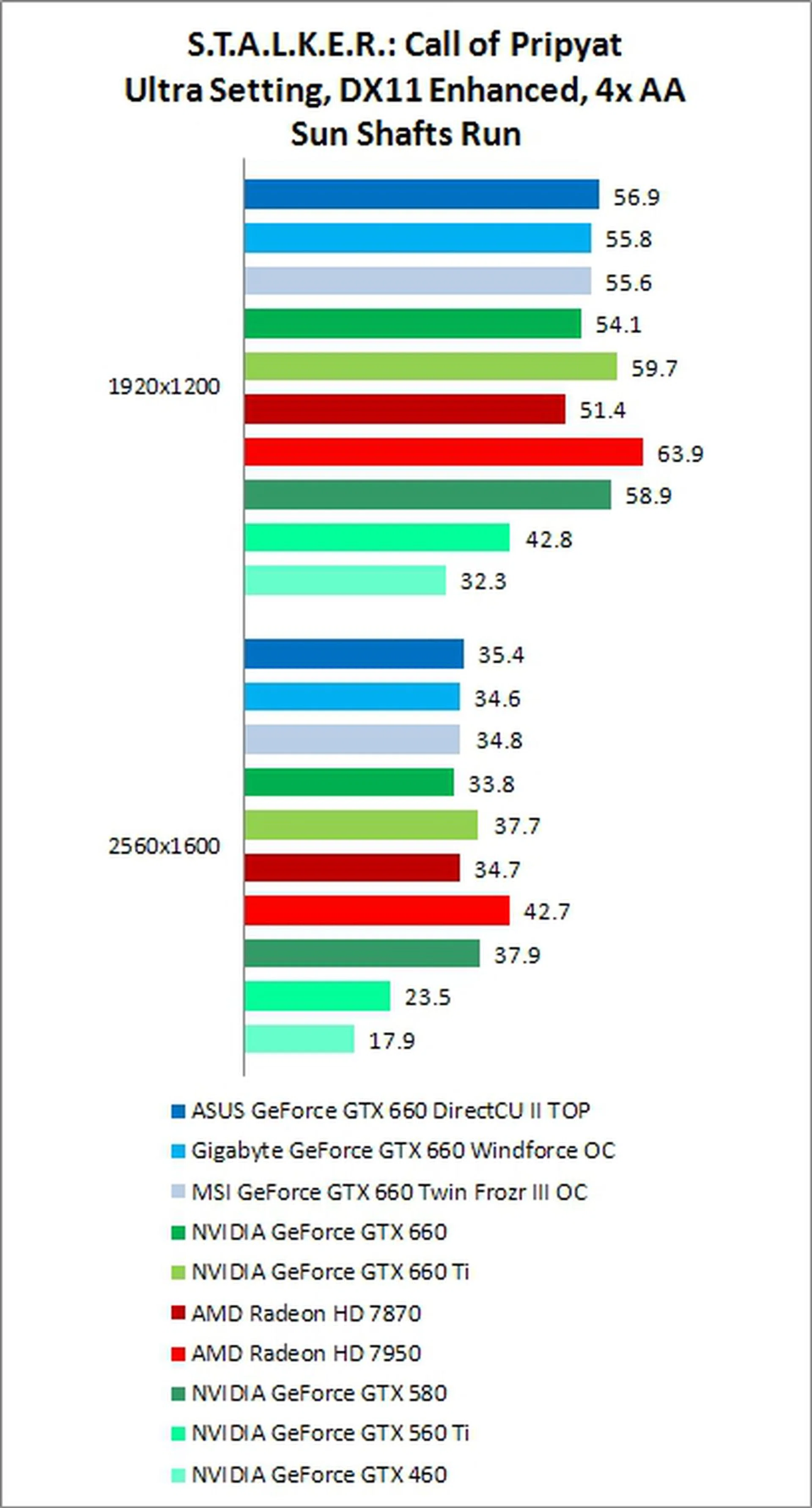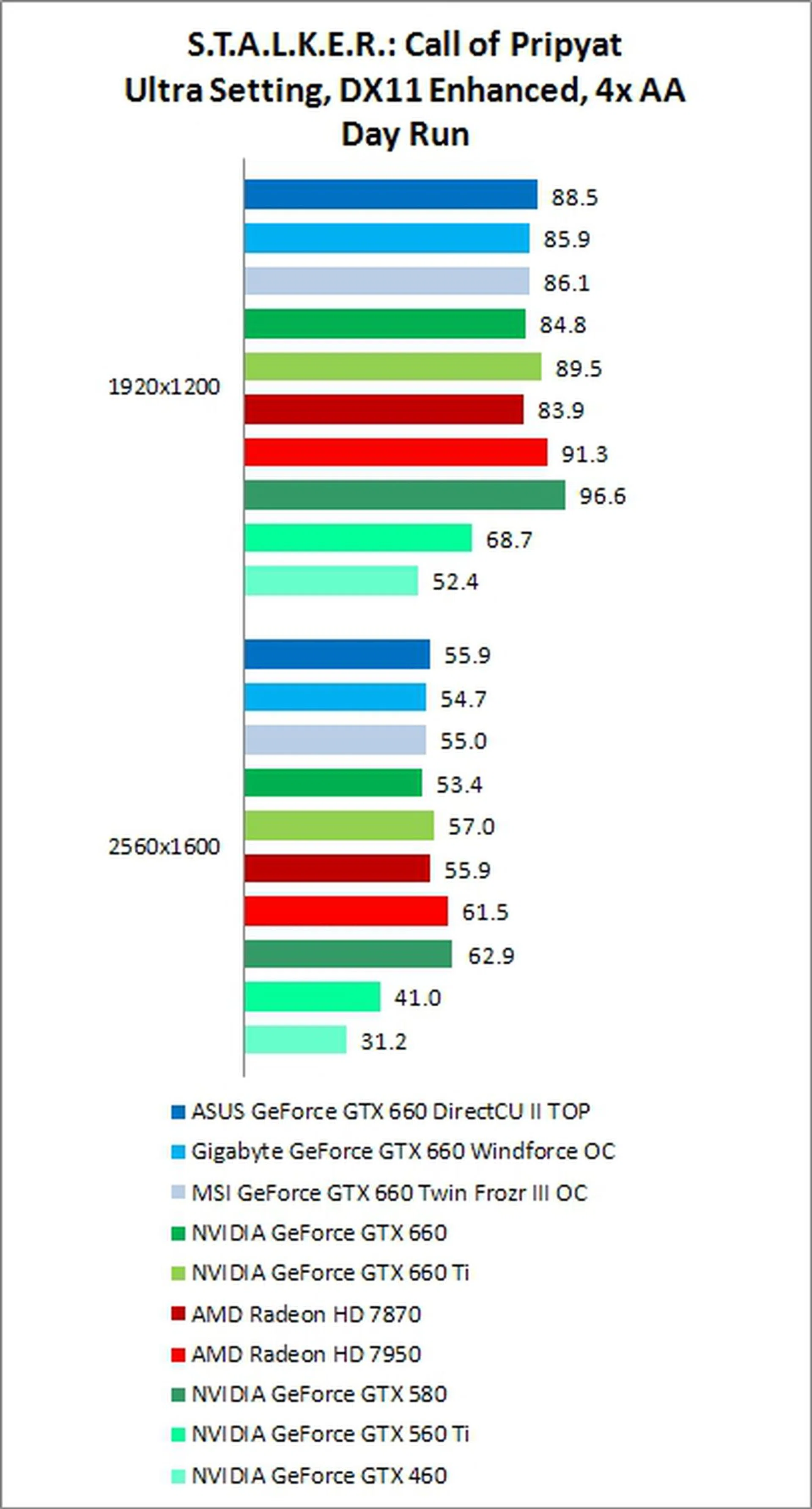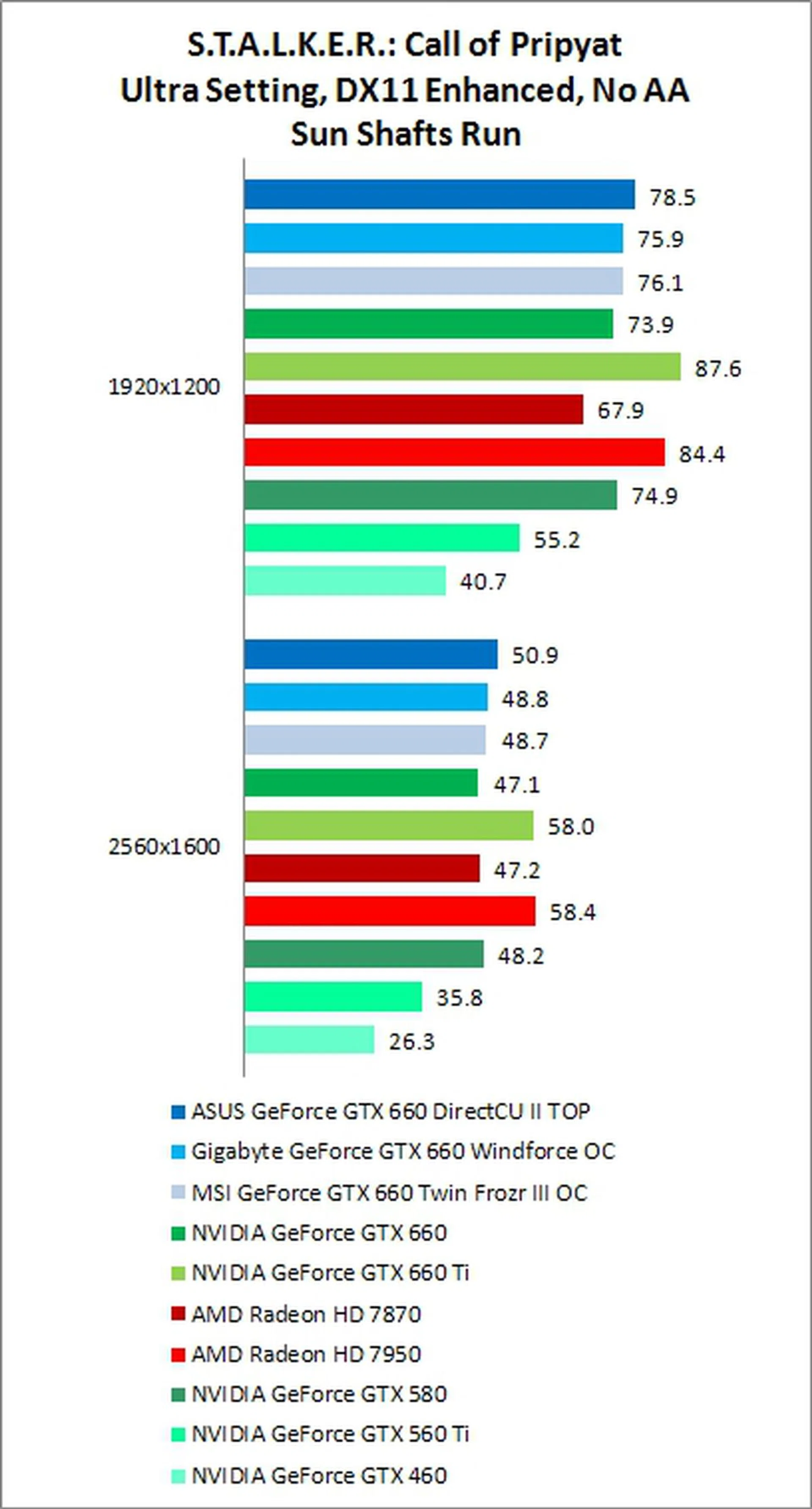 Performance for the GTX 660 on S.T.A.L.K.E.R.: Call of Pripyat was fairly close to AMD's Radeon HD 7870, with the exception of the 1920 x 1200 resolution, No AA, Day Run, where the GTX 660 was able to score a significant win.