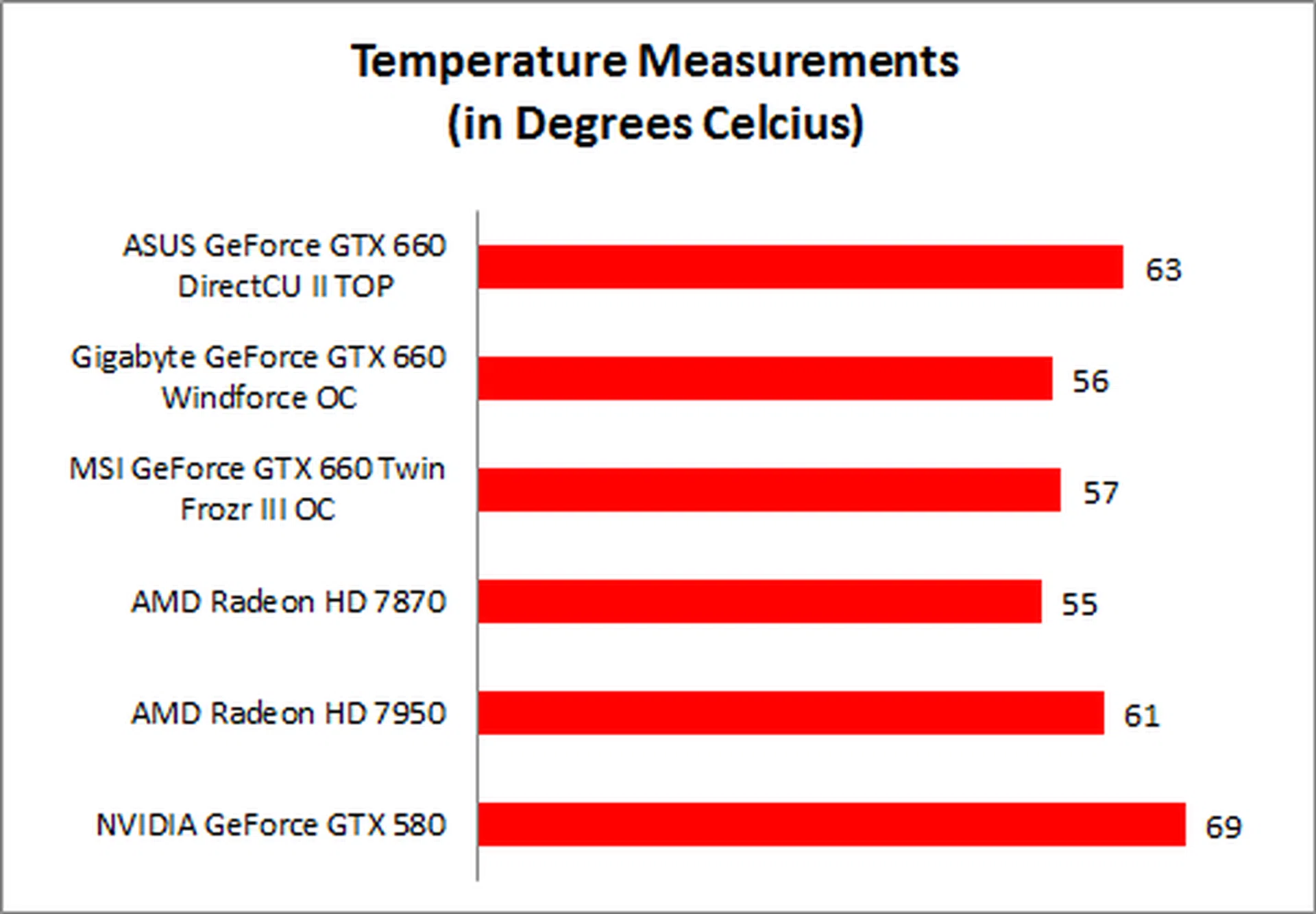 Gigabyte was the coolest performer, in contrast to the poor performance of the same cooler on the GTX 660 Ti. It seems that Gigabyte's 'open design' is better suited to lower-end cards with lower power consumption as airflow may not matter as much, and the presence of the two large 100mm fans is sufficient to keep the card cool. MSI was just one degree higher in temperature, which may be due to its slightly higher power consumption.