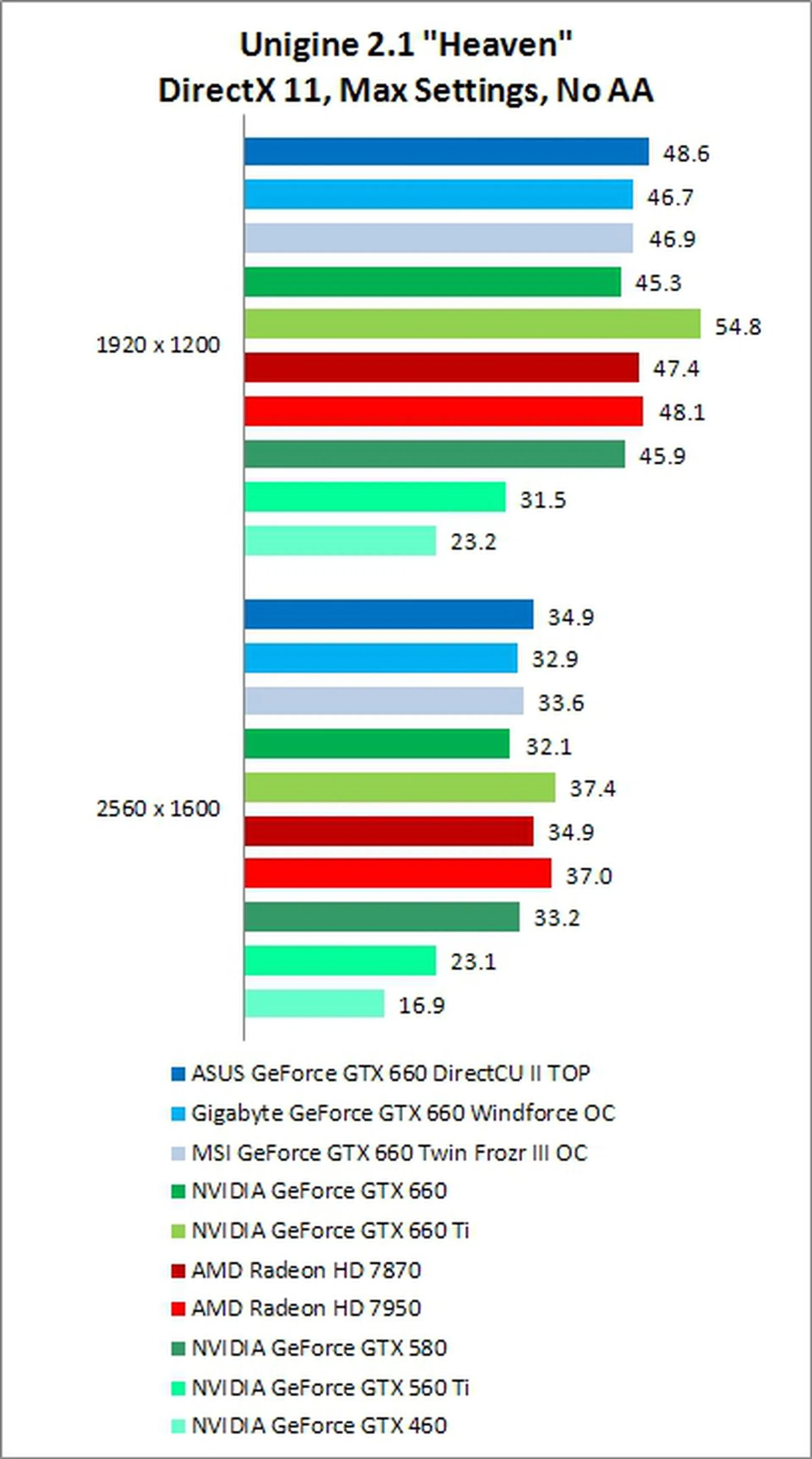 As we've come to expect from benchmarks with high tessellation, the GTX 660 did not fare quite as well as the AMD contenders. However it was still within striking distance, falling behind by only 3% on 1920 x 1200, and by about 10% on 2560 x 1600. While these numbers may seem high, in terms of actual tangible FPS, the difference was very small, with only about 1 FPS difference between them.