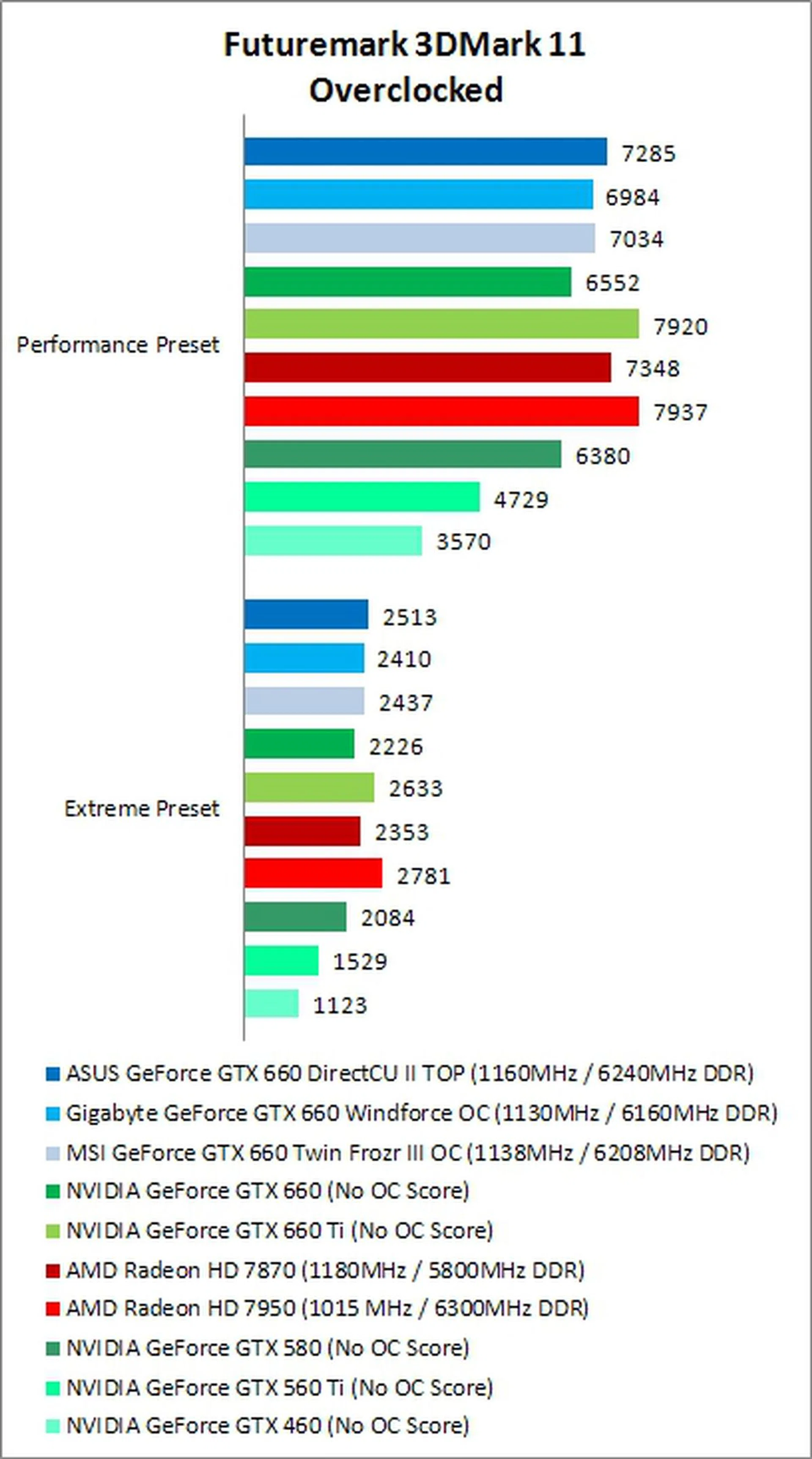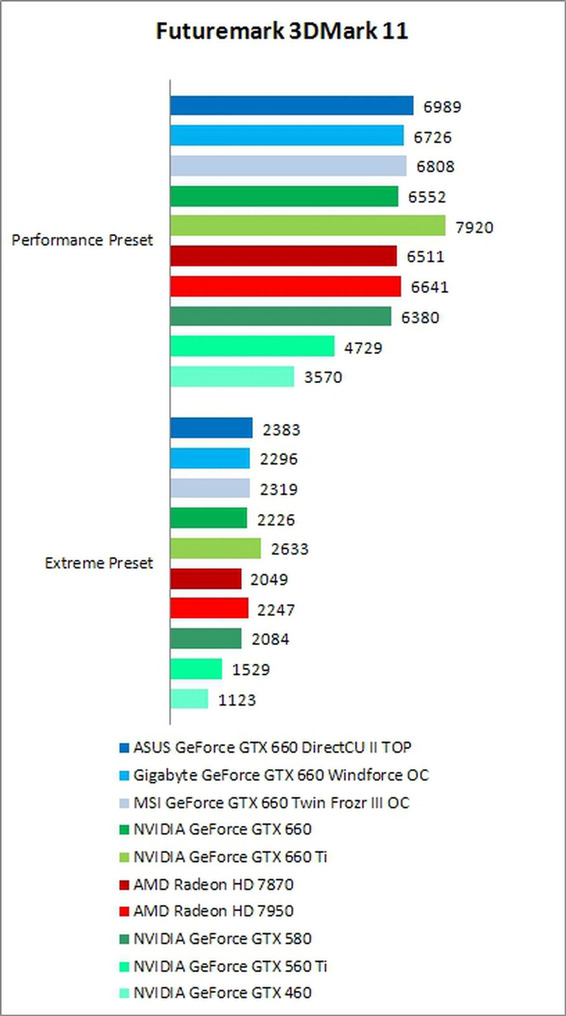 Overclocking on the GTX 660 was fairly successful and followed a similar pattern to the rest of our benchmarks. ASUS was again the best performer, with core speeds raised to 1160MHz and memory to 6240MHz DDR, increasing its performance by about 4% on 3DMark 11's Performance preset, and by 6% on Extreme compared to its default settings. Compared to the reference card, this was about 11%-13% better than the its default speeds.