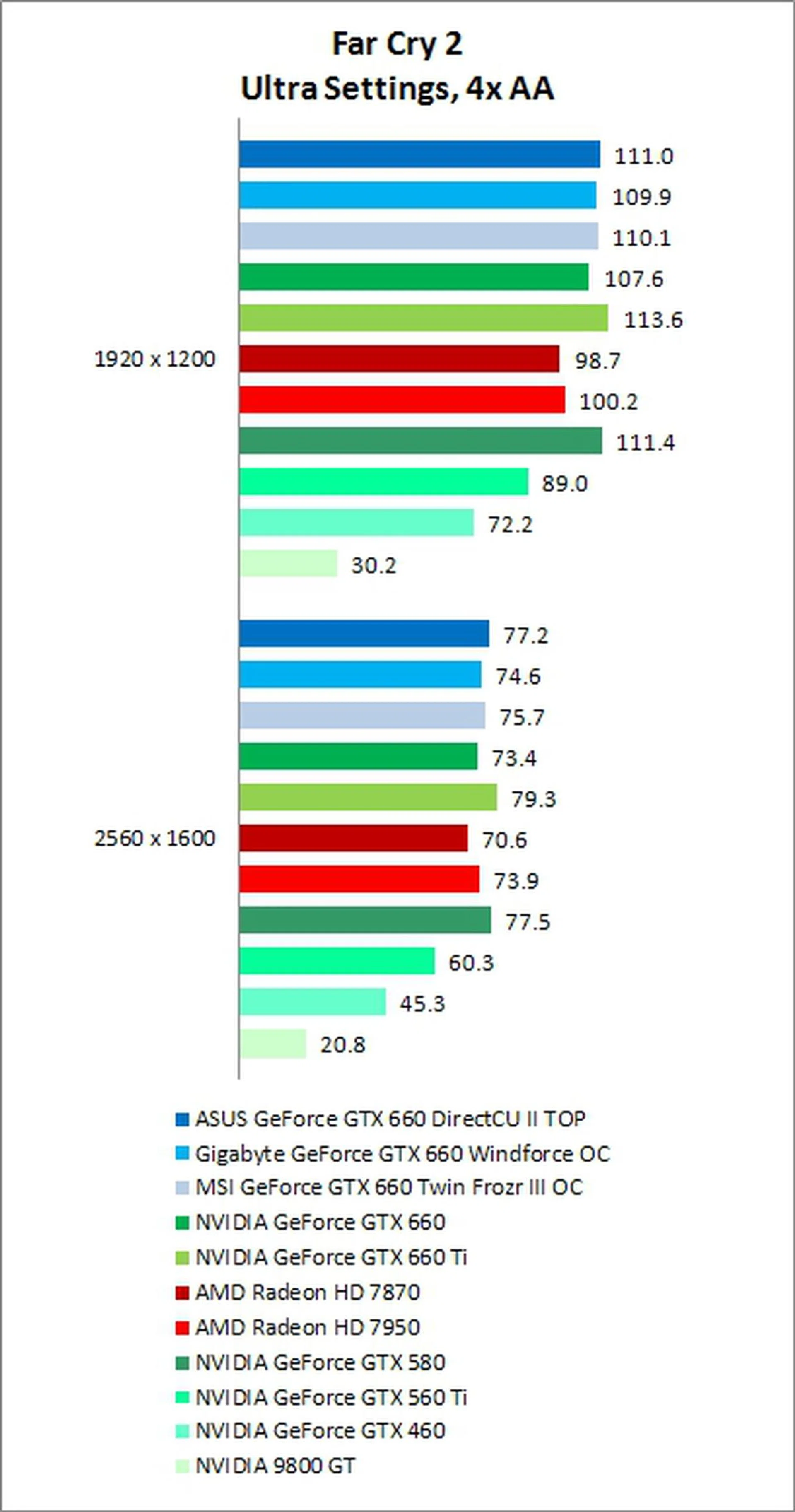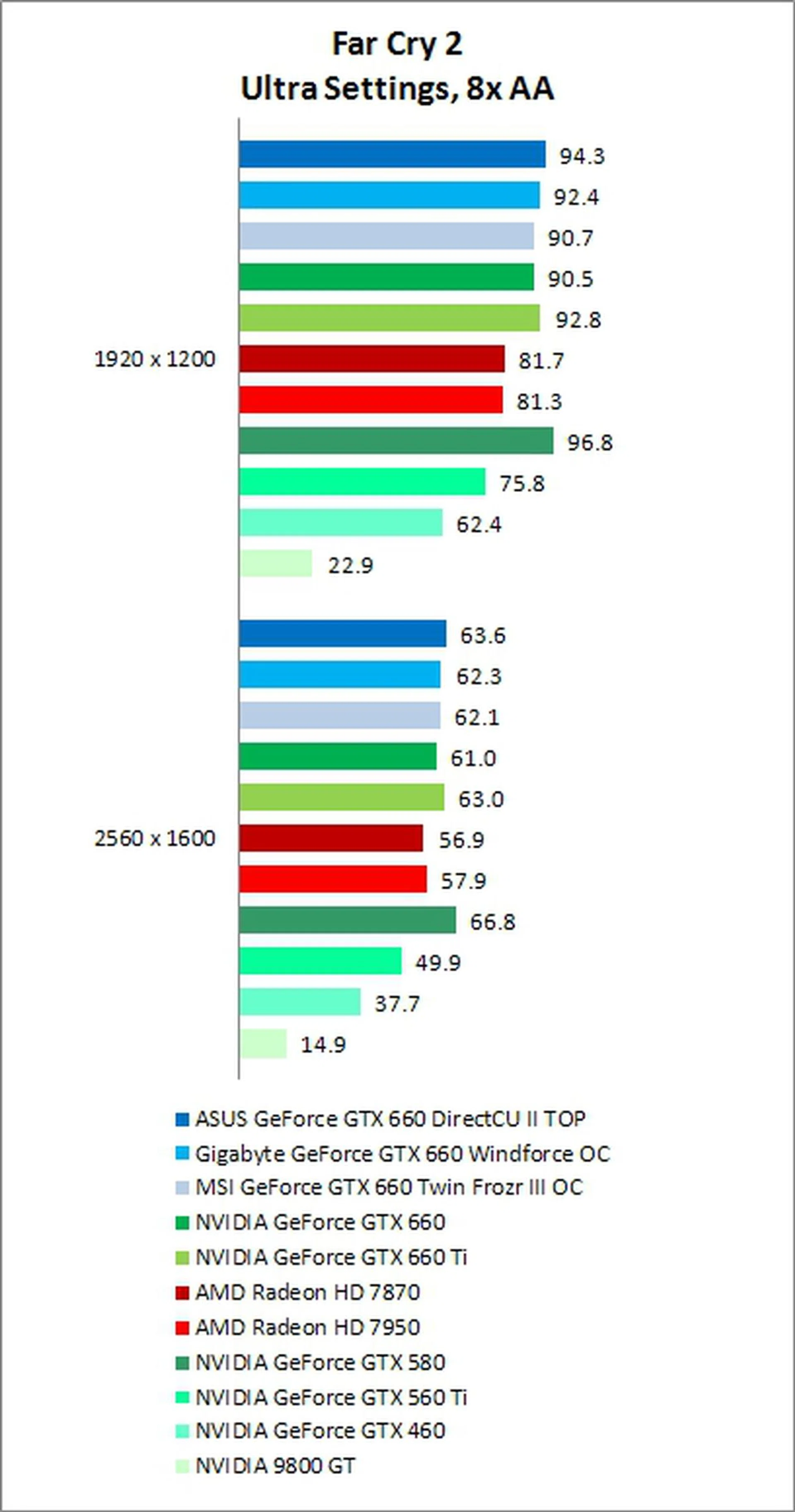In Far Cry 2, the GTX 660 was once again able to outperform its competitors from AMD and this time was also within reach of the GTX 660 Ti.