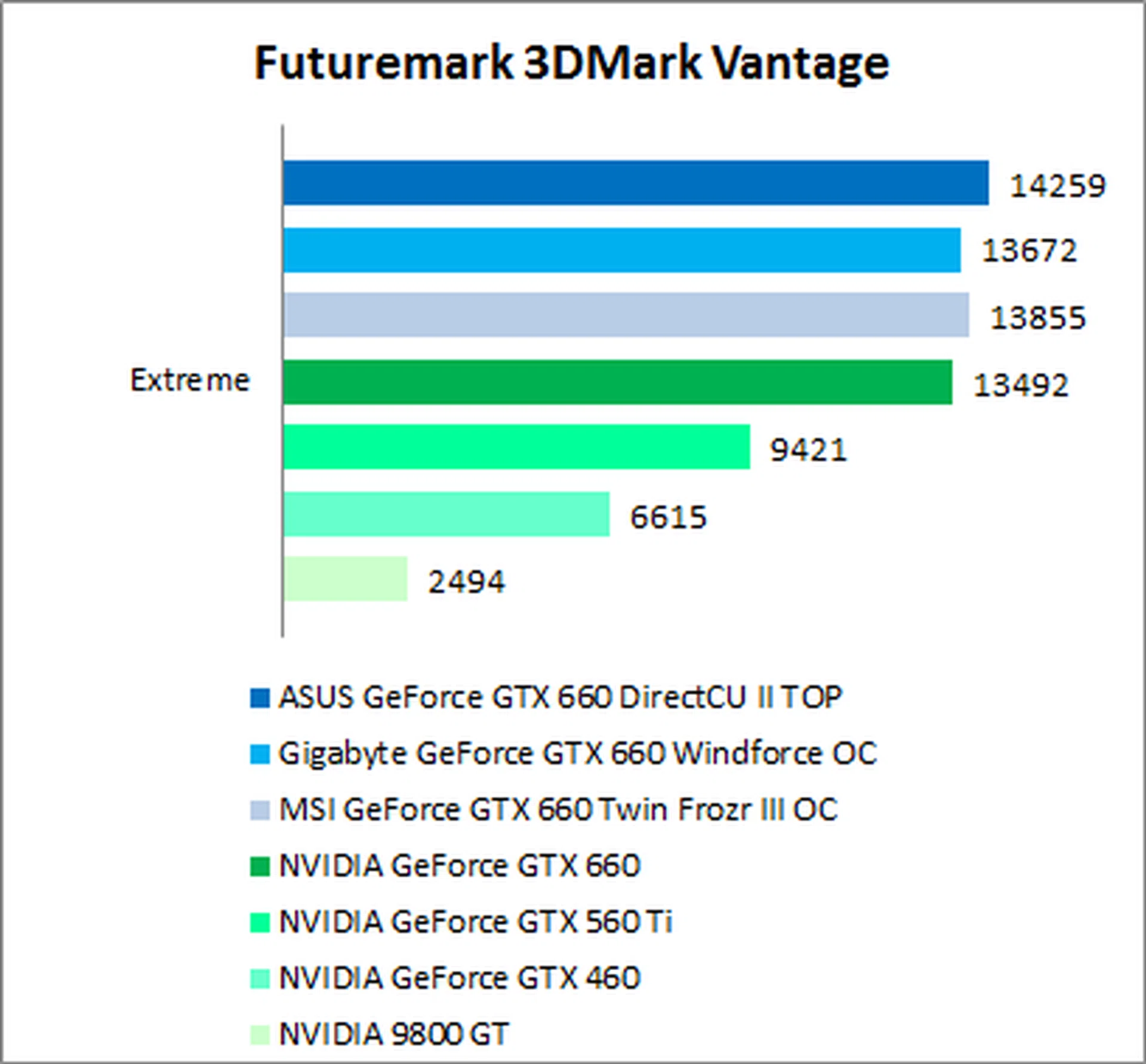 - While most of our benchmarks are run on DX11, we've thrown in a page of older DX10 compatible tests which include NVIDIA's 9800 GT, for the 53% of NVIDIA card users out there still using this card. This should give you an idea of how much of an upgrade you can expect going from the 9800 GT to the GTX 660. NVIDIA's 9800 GT was available in a number of different specs, with either 512MB or 1GB memory being the most significant difference. We have chosen the 1GB version as our tests are run on 1920 x 1200 and 2560 x 1600 resolutions, where 512MB memory would be insufficient. The actual card in question is MSI's GeForce N9800GT-MD1G (an eco-oriented card), overclocked to reference specs of a standard GeForce 9800 GT.