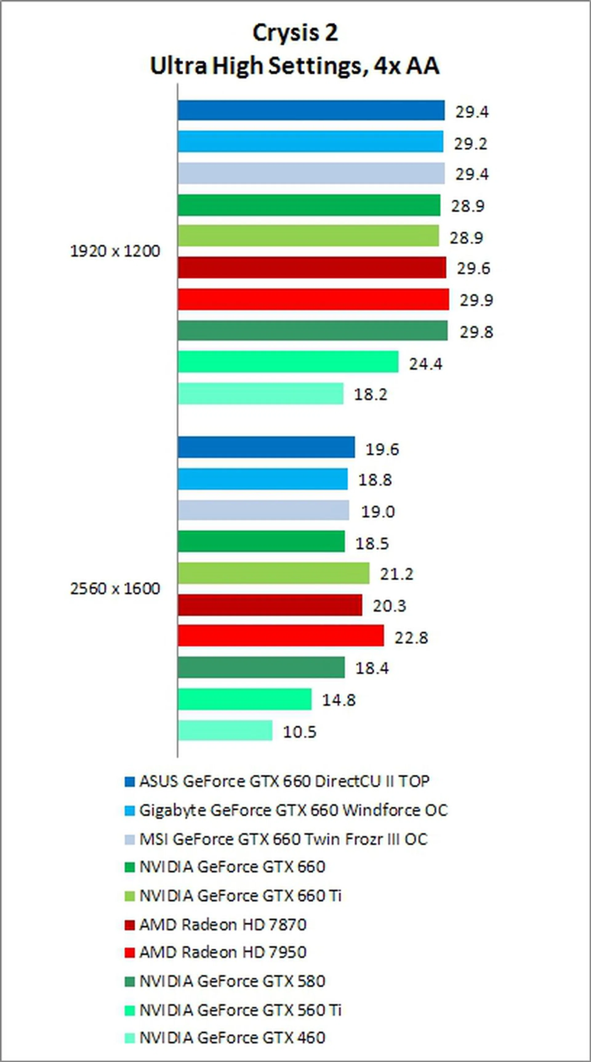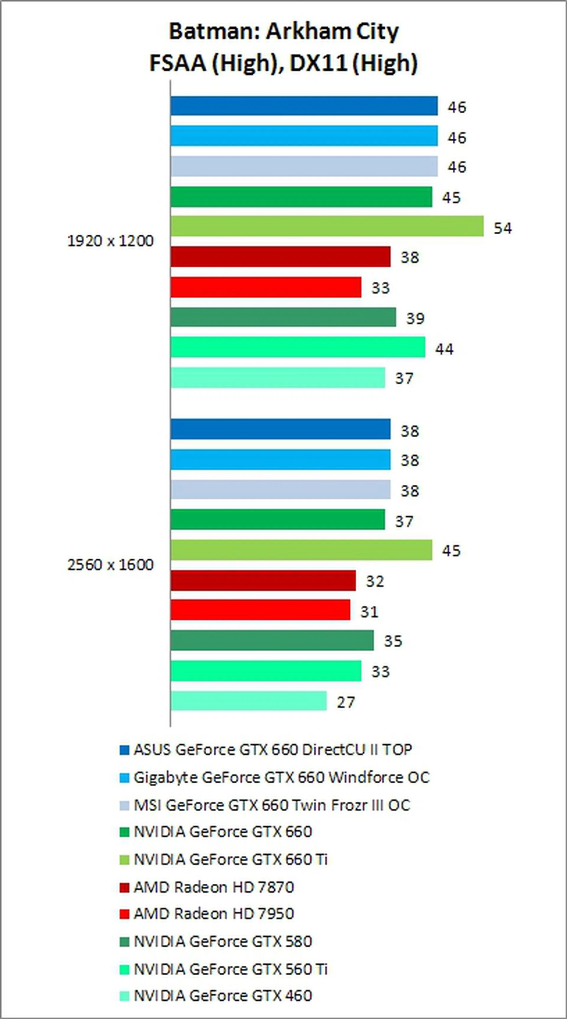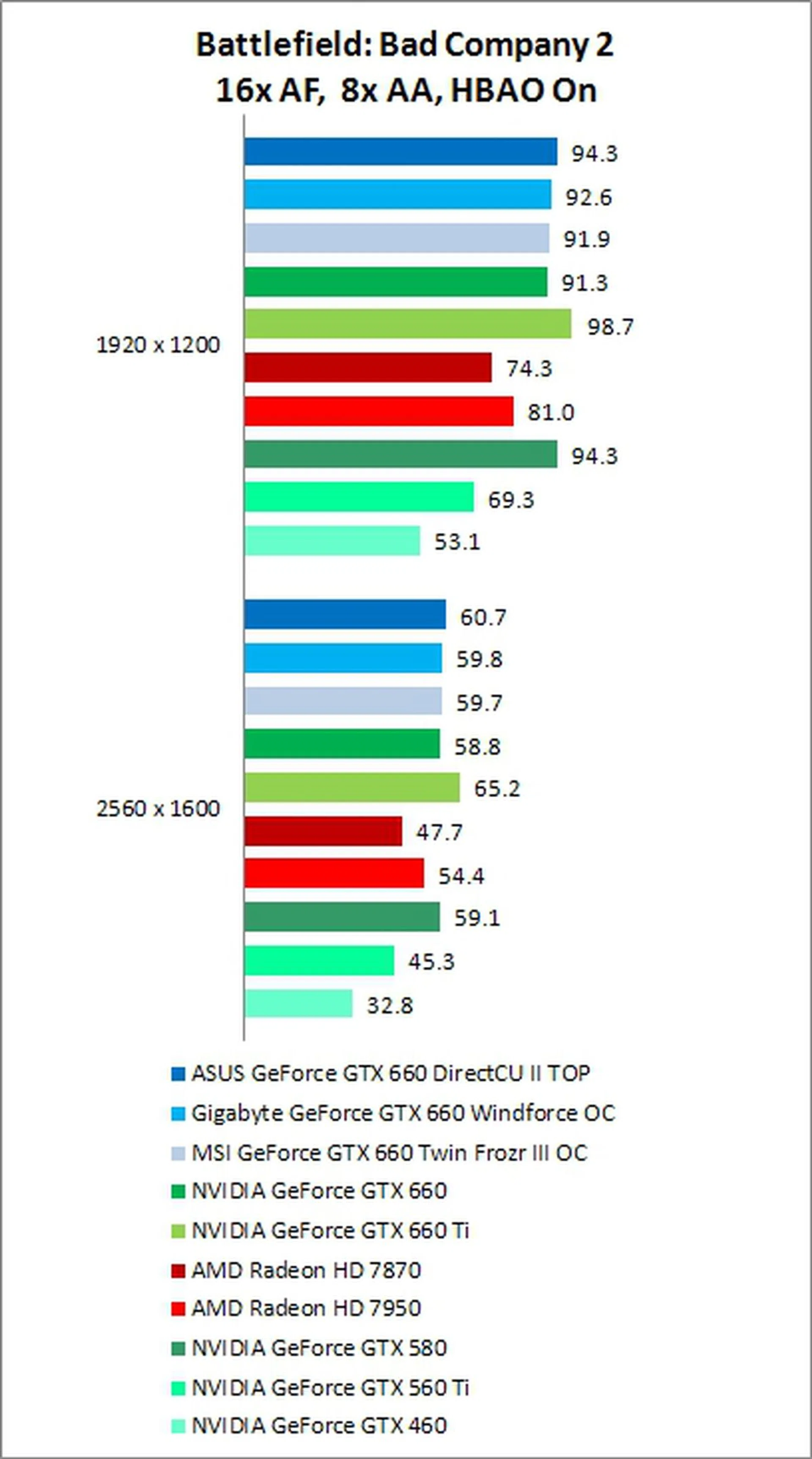 The GTX 660 excelled at this DX11 game. While it may be getting a bit old, Battlefield: Bad Company 2's Frostbite 1.5 engine is still a good test of a GPU’s geometry shading power. Impressively, the GTX 660 managed to beat both the HD 7870, and also the higher-end HD 7950, scoring more than 12% better than the latter at 1920 x 1200, and more than 6% better at the 2560 x 1600 pixels resolution.