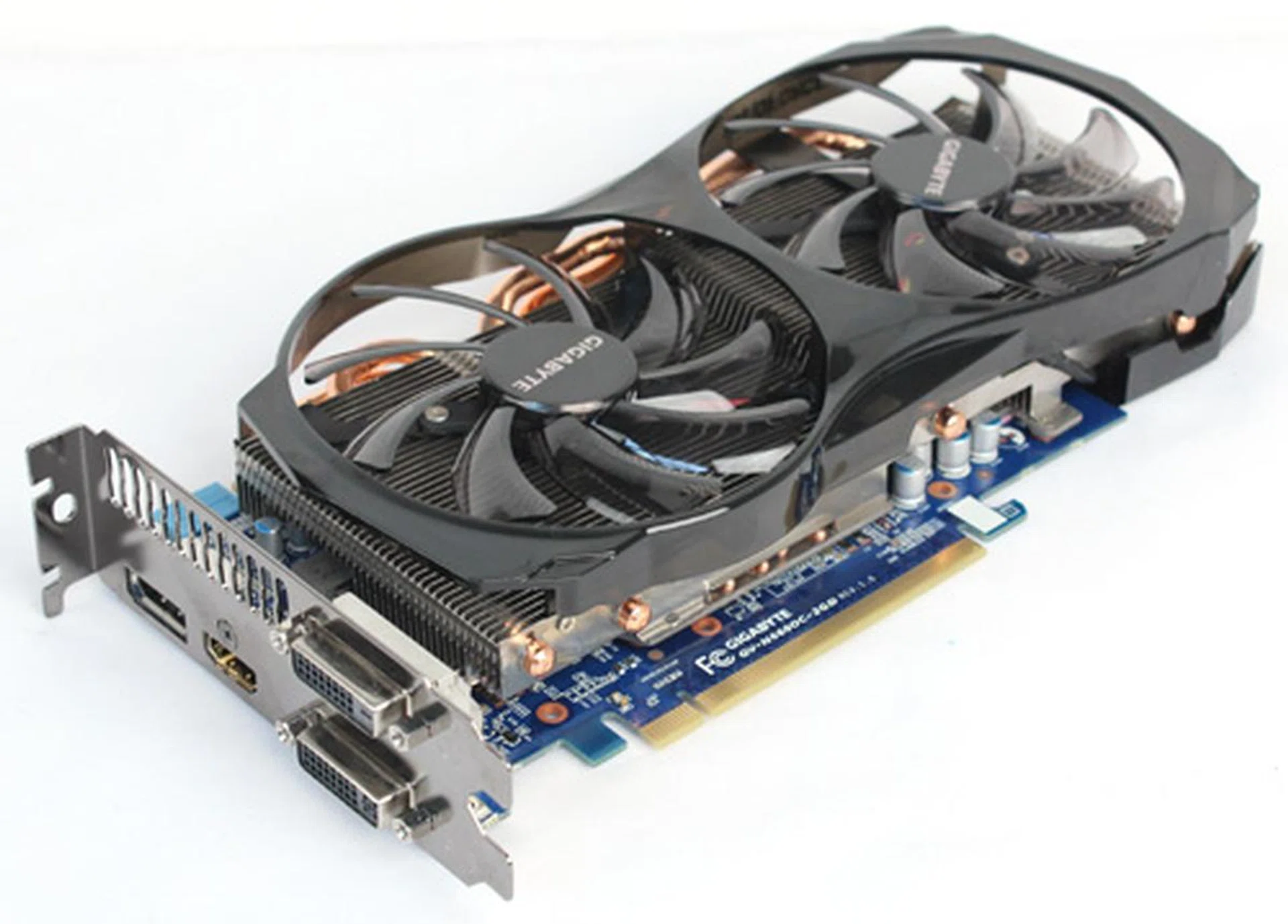 Under the fans, four 6mm copper heatpipes are connected to two heatsinks, one directly over the GPU, and one elevated to the side.