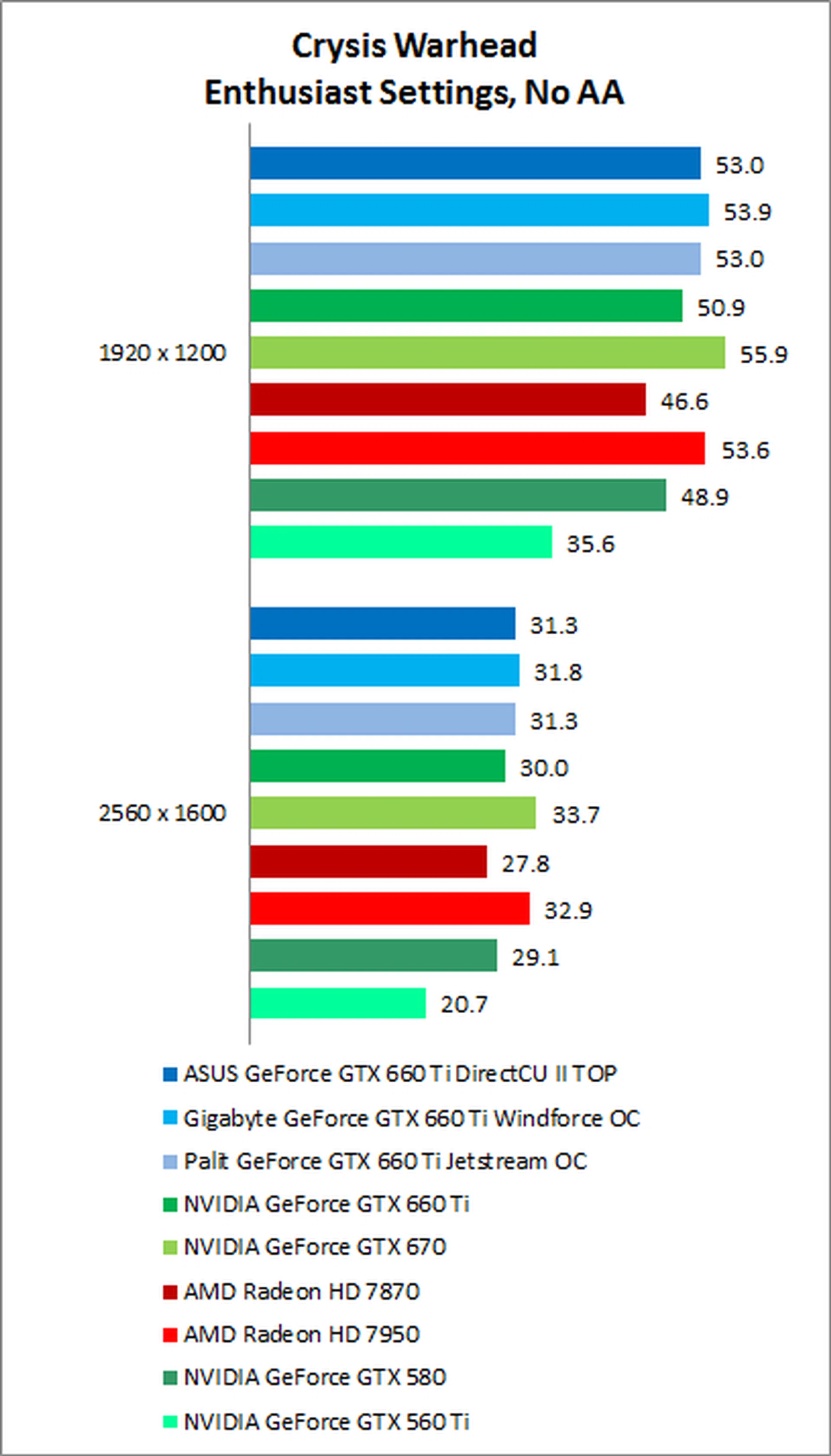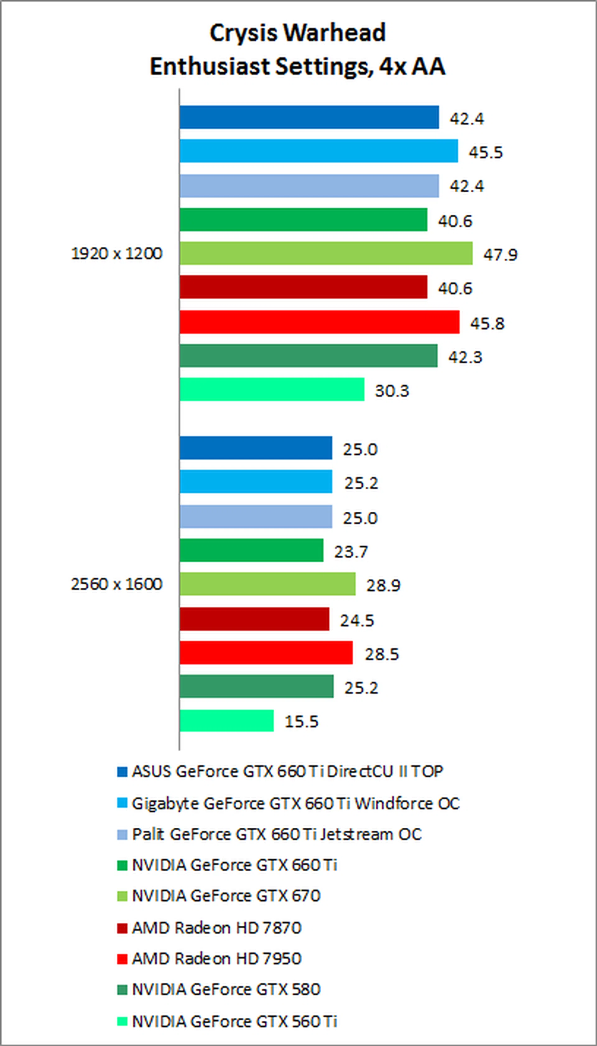 While Crysis Warhead is running on a DX10 engine, it is still fairly taxing and features heavy tessellation. This was the first benchmark in which the GTX 660 Ti lost to AMD's Radeon HD 7950 and was instead very close to the Radeon HD 7870 in performance.