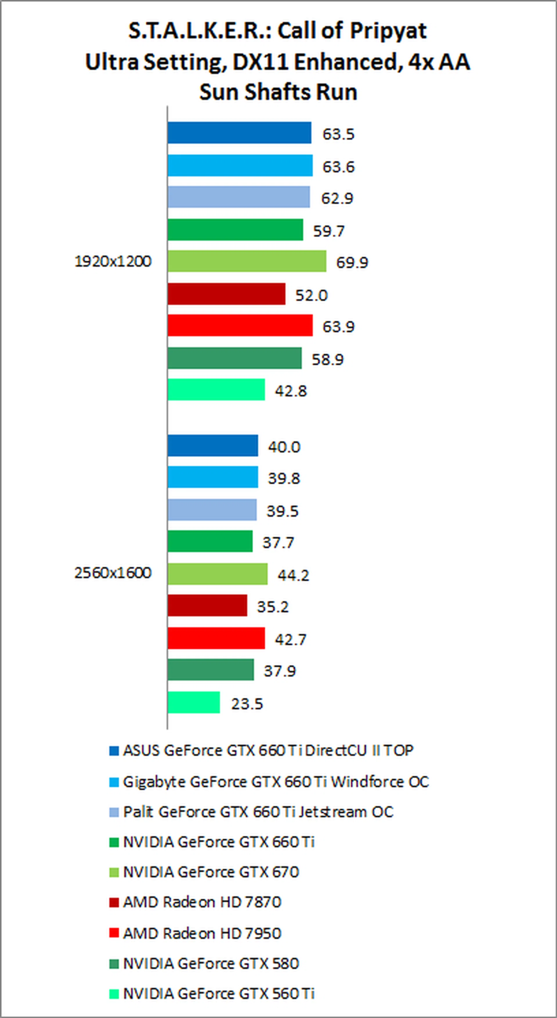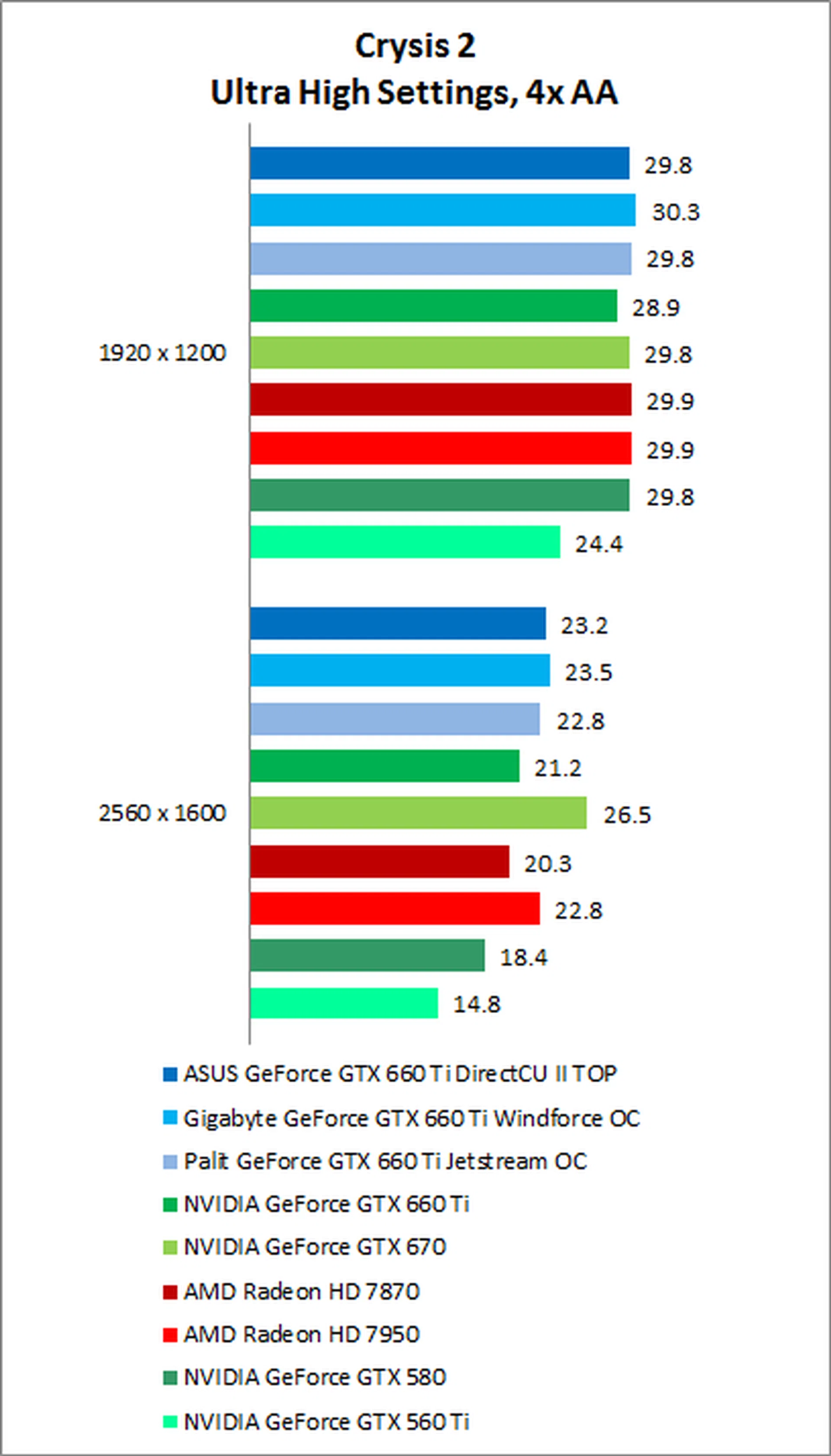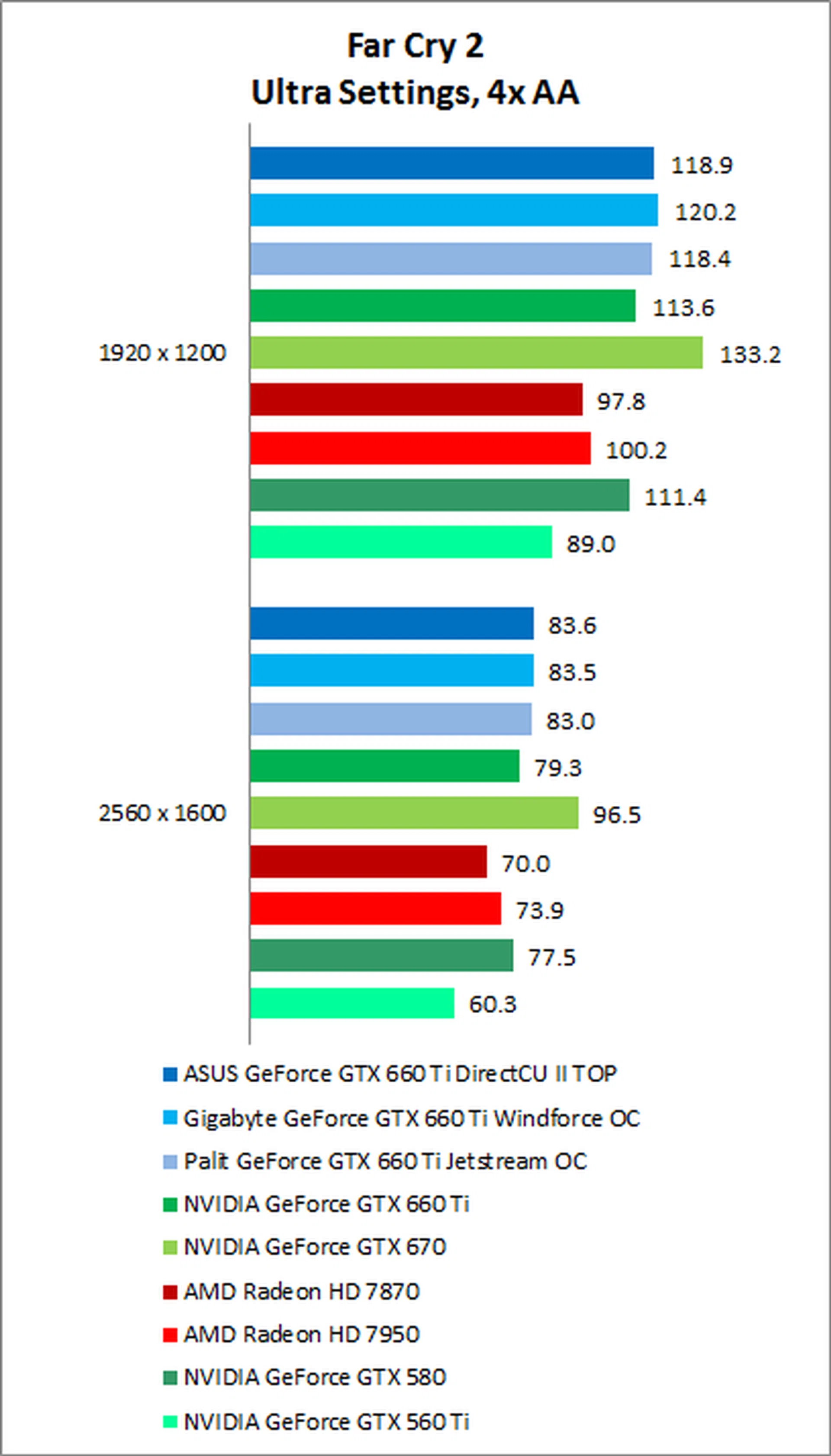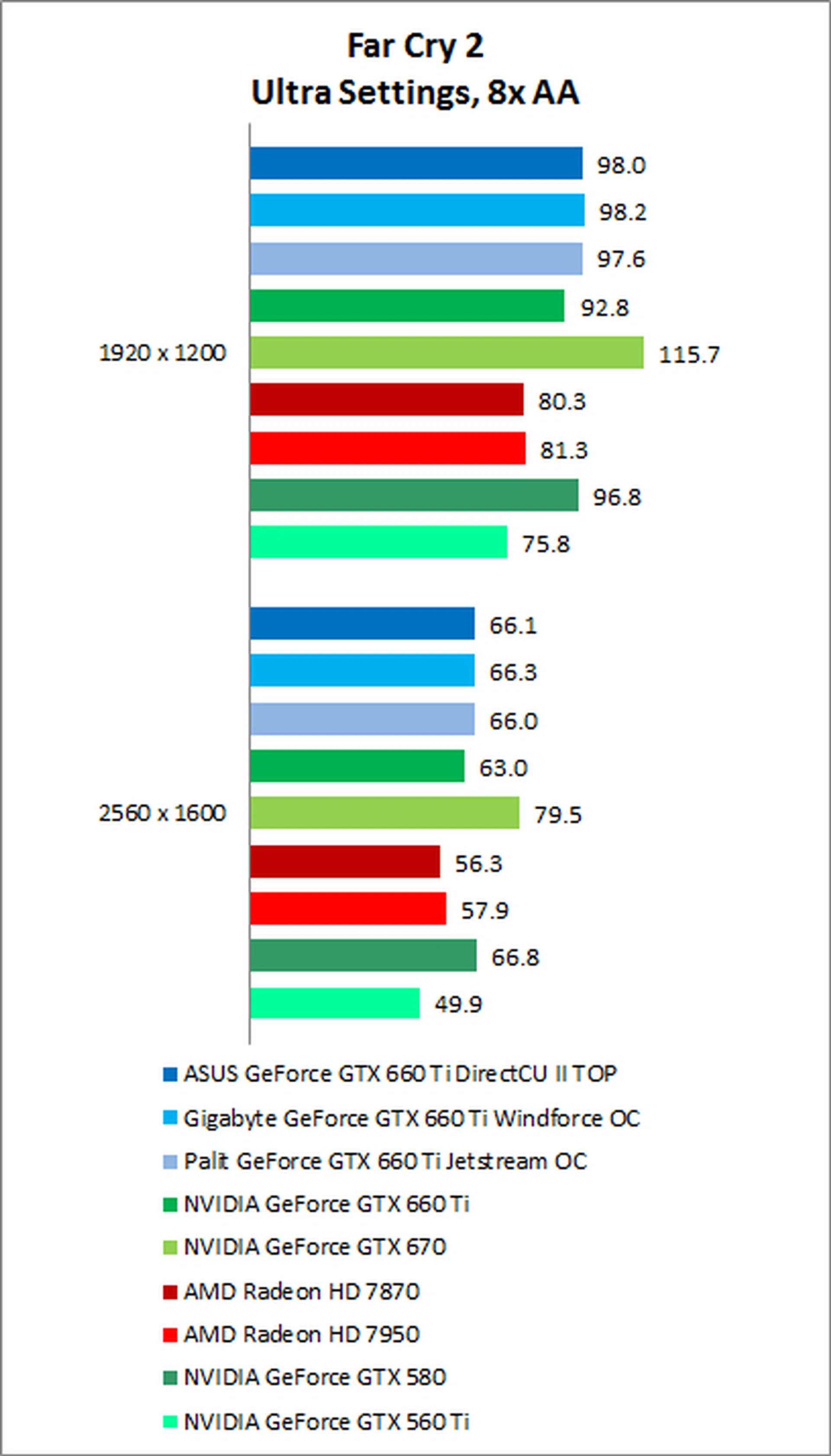 Far Cry 2 uses a DX10 engine and as such, isn't as taxing on newer cards. Nevertheless, even at the highest resolution of 2560 x 1600 pixels, with 8x AA turned on, the GTX 660 Ti was once again able to outperform both the HD 7870 and the HD 7950. It was however about 25% behind the GTX 670.