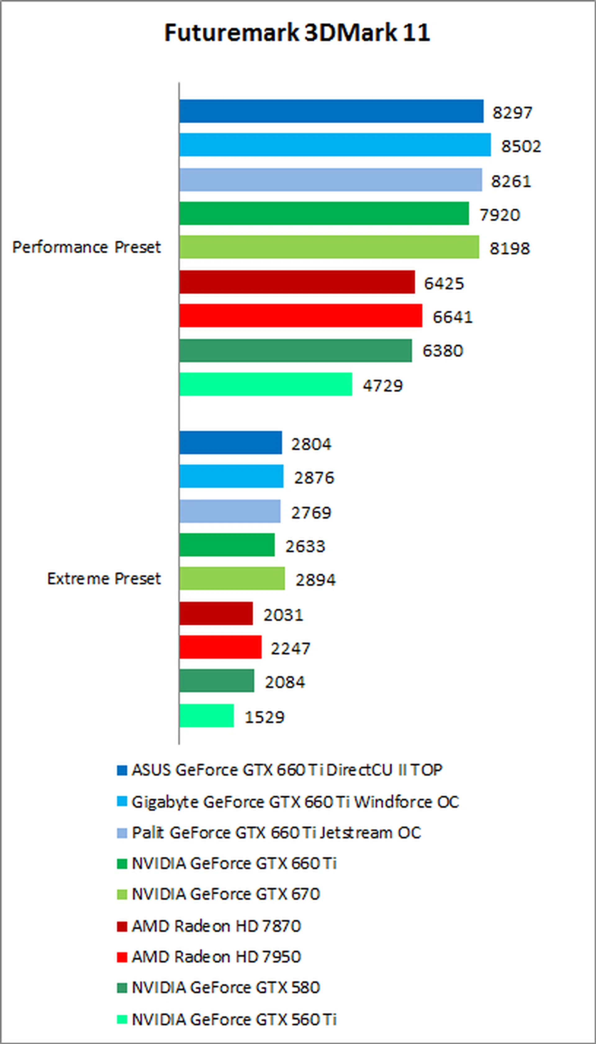 Against AMD, our custom GTX 660 Ti cards were very impressive. Compared to the overclocked HD 7950, they were all 7-10% better at both presets, and compared to the overclocked HD 7870, they scored 20% better at Performance, and a whopping 25% better at Extreme.