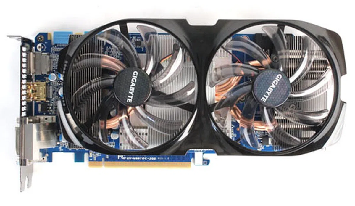 Under the fans, two copper heatpipes are connected to two heatsinks, one directly over the GPU, and one elevated to the side. The heatsink directly over the GPU uses Gigabyte's Triangle Cool technology, which consists of a triangular internal structure, with the downward slopes designed to direct airflow from the fans towards the top and bottom of the video card for better heat dissipation.