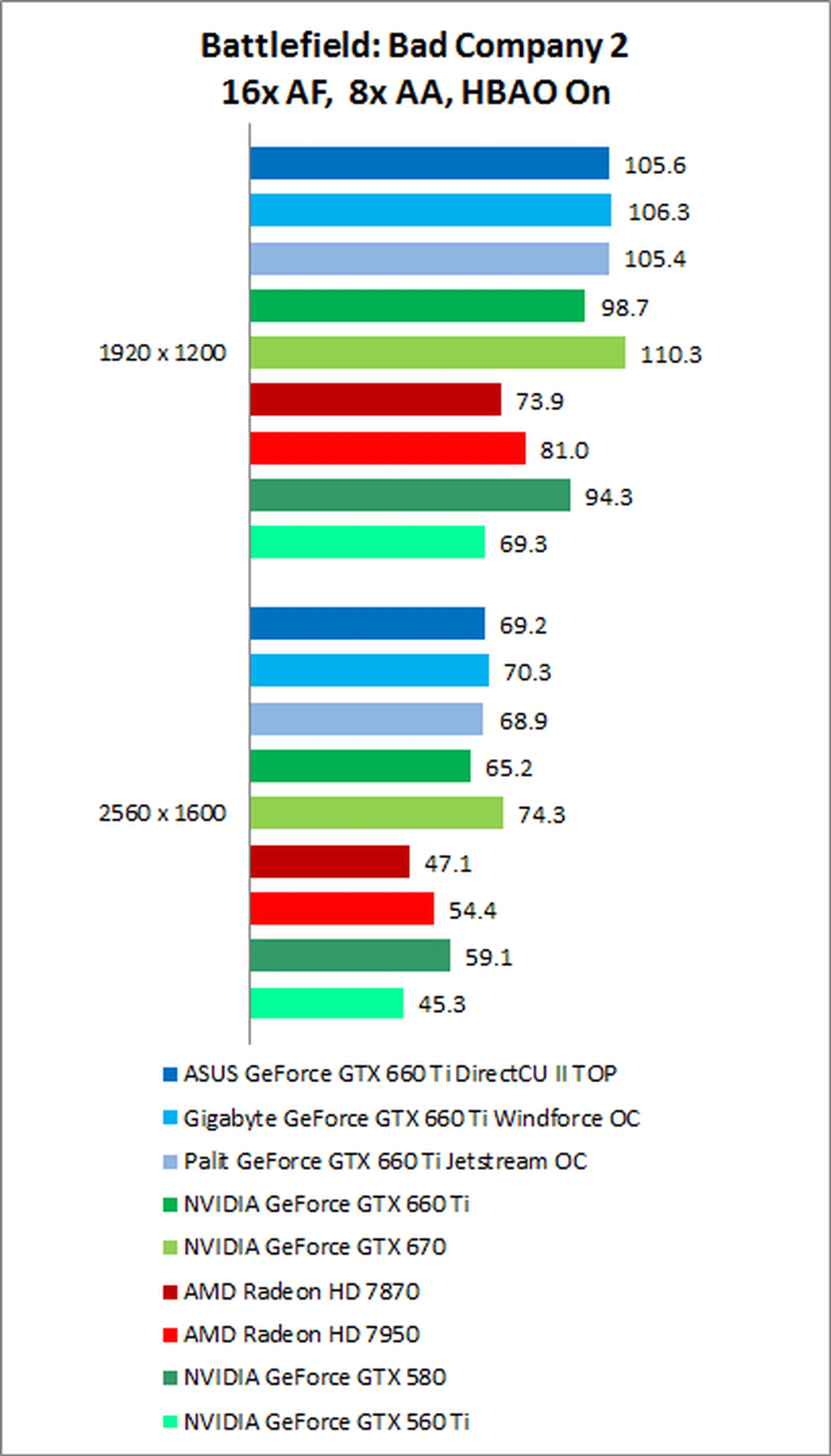 Battlefield: Bad Company 2's DX11 Frostbite 1.5 engine is old but still a good test of a GPU’s geometry shading power. The GTX 660 Ti handled the game with ease, scoring near 100FPS at the 1920 x 1200 pixels resolution, with all three custom cards surpassing 100FPS.