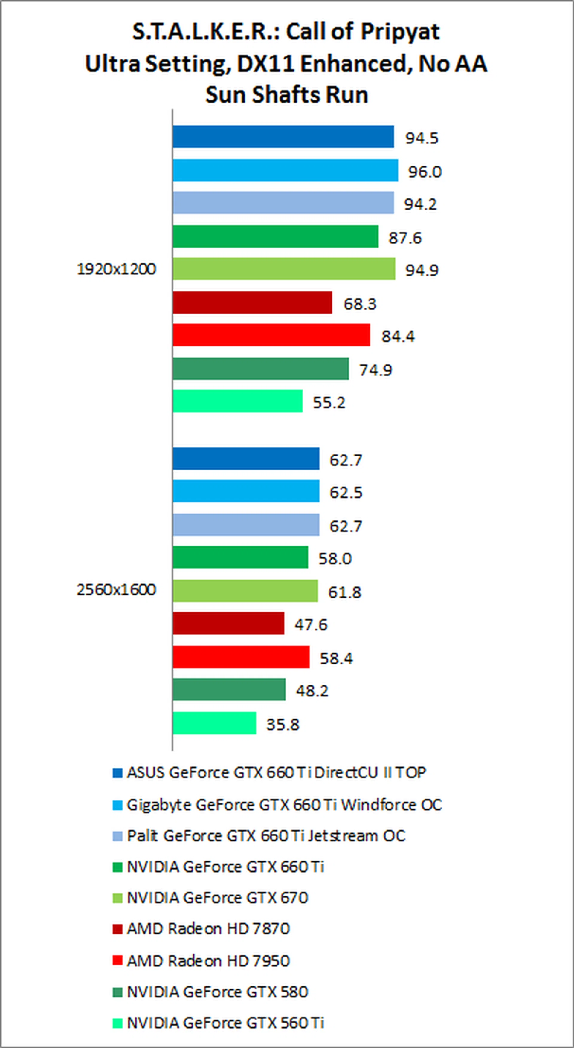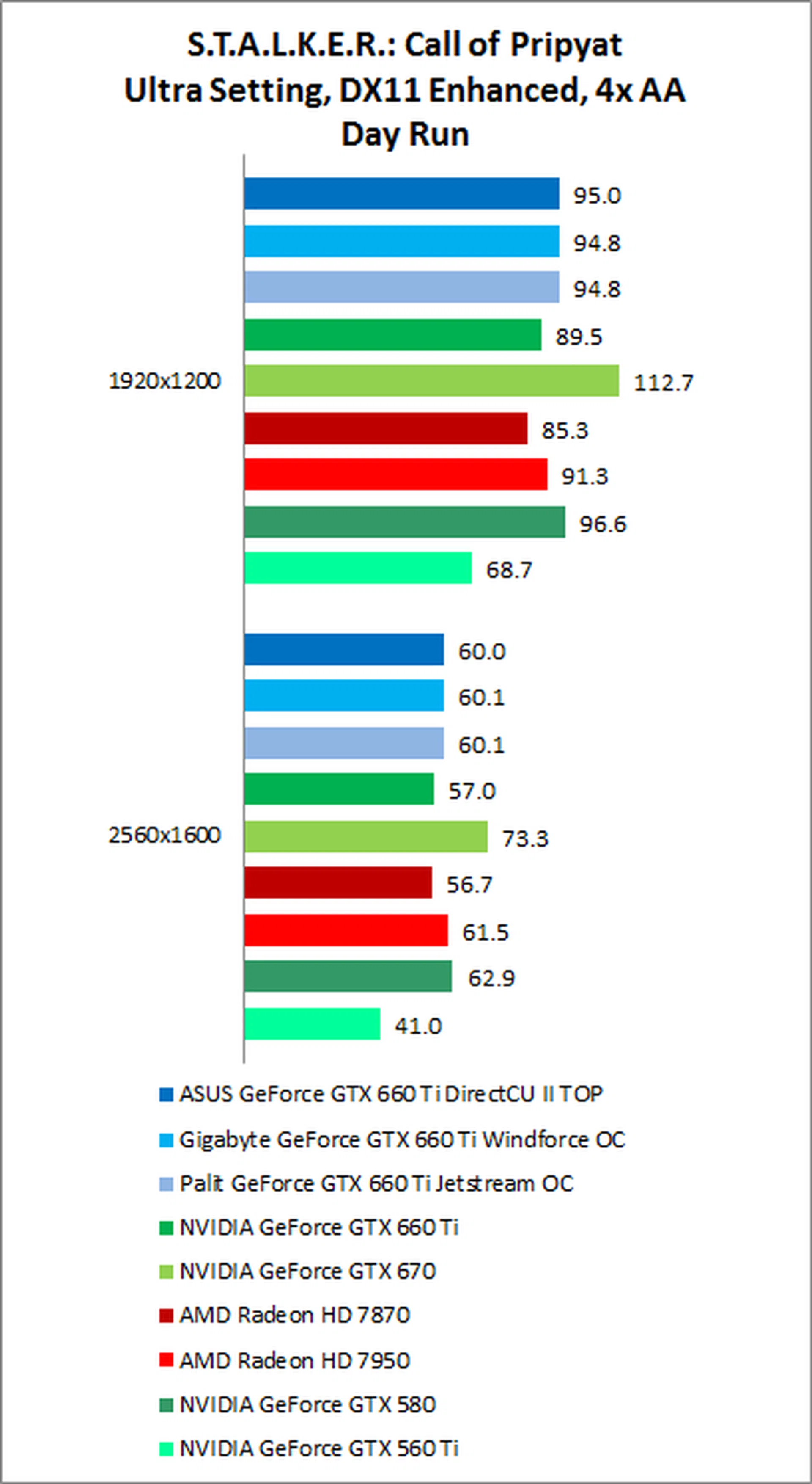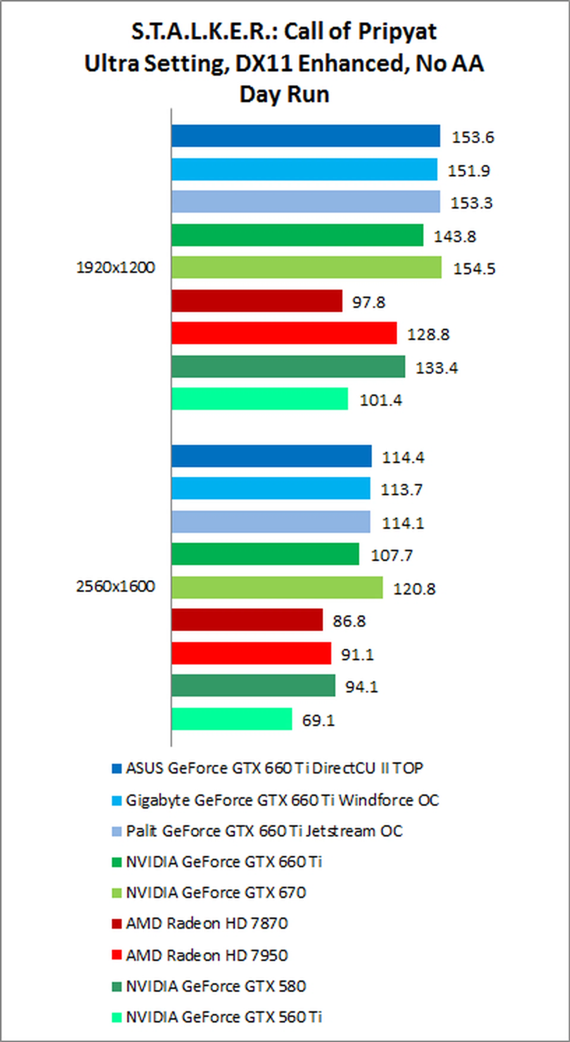 Compared to the AMD Radeon HD 7870, the GTX 660 Ti was able to outperform it at all settings and resolutions, outperforming it by as much as 47% on the Day Run with AA turned off at the 1920x1200 pixels resolution. At 2560x1600 resolution, with 4x AA, this gap closed to about 7%, but it was still an impressive victory for NVIDIA.