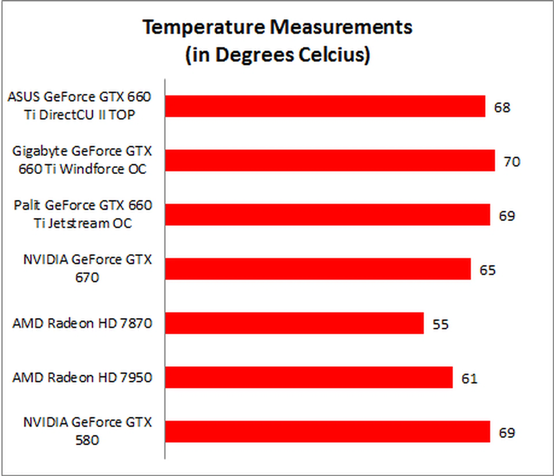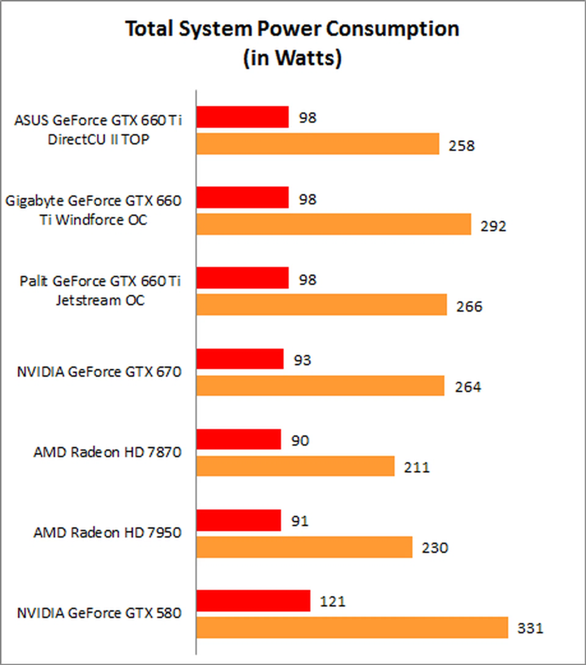 If you're wondering how a non overclocked GeForce GTX 660 Ti graphics card with a standard cooler would fare, in the worst case scenario, it would register just a little lower than the GeForce GTX 670. The huge GK104 core used on the GTX 660 Ti would ensure that power and temperature results won't actually differ a whole lot from the GTX 670.