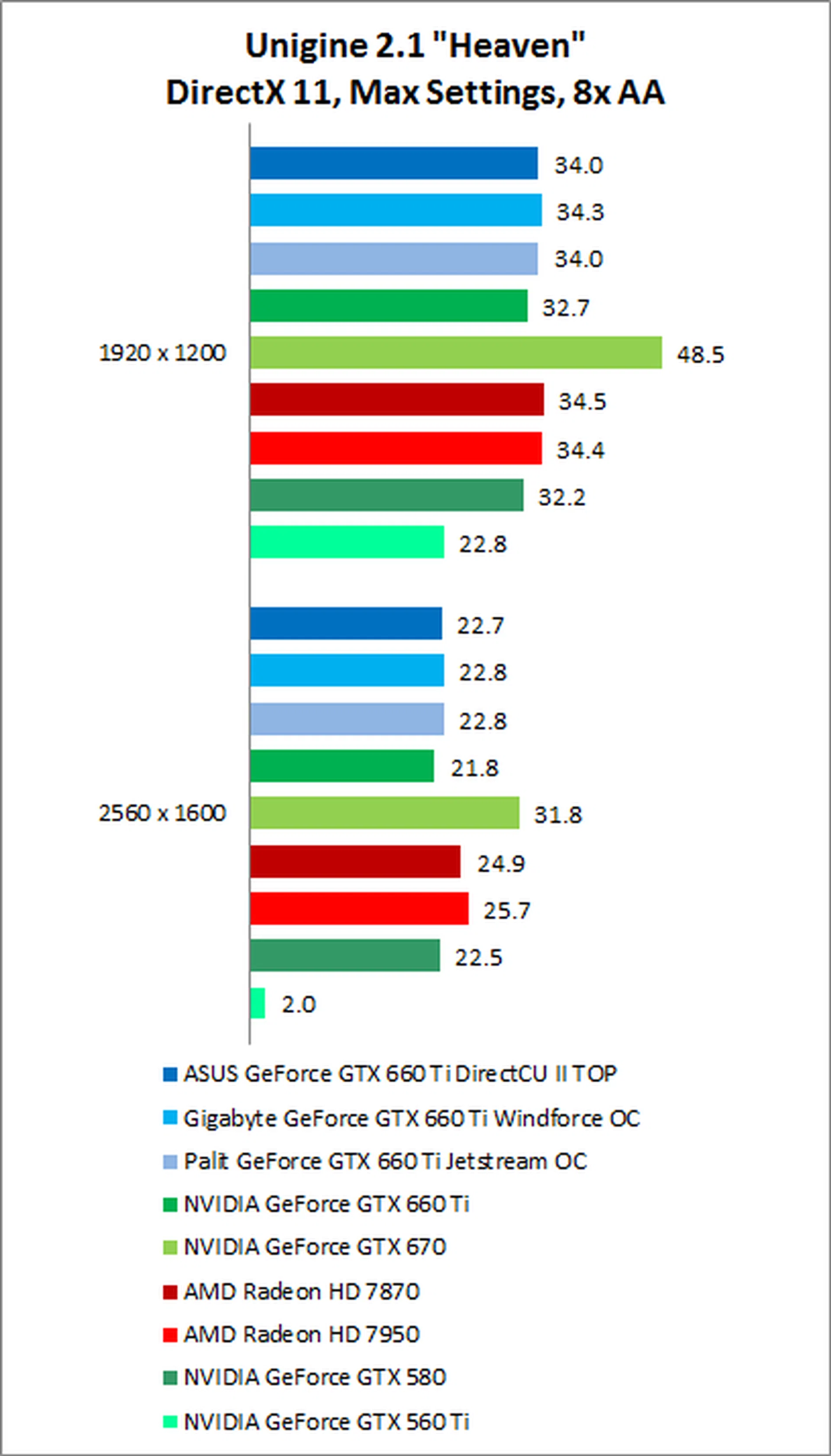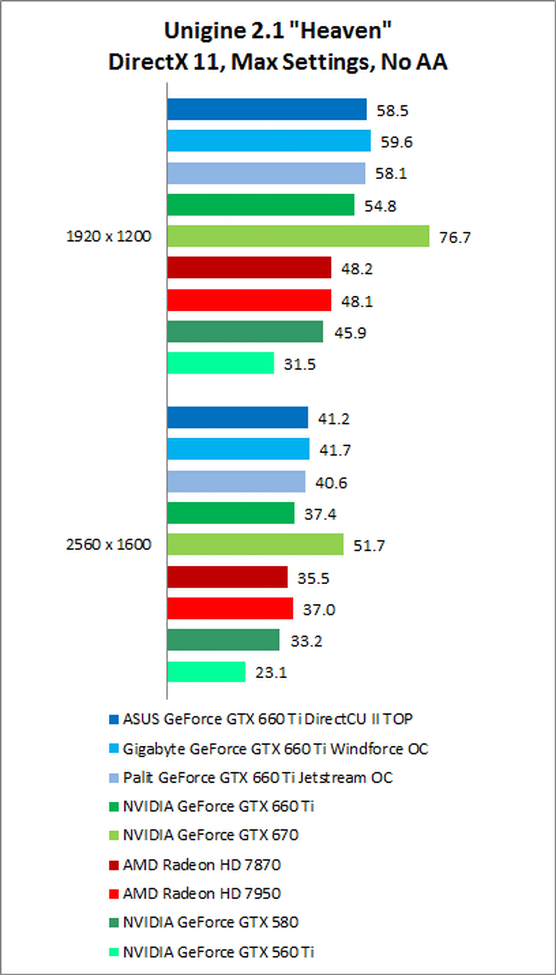 The GTX 660 Ti was not as impressive in the synthetic Unigine 2.1 "Heaven" benchmark, falling behind the GTX 670 by approximately 40%. However, it still outperformed both its rival from AMD, the HD 7870, as well as the higher-end HD 7950.