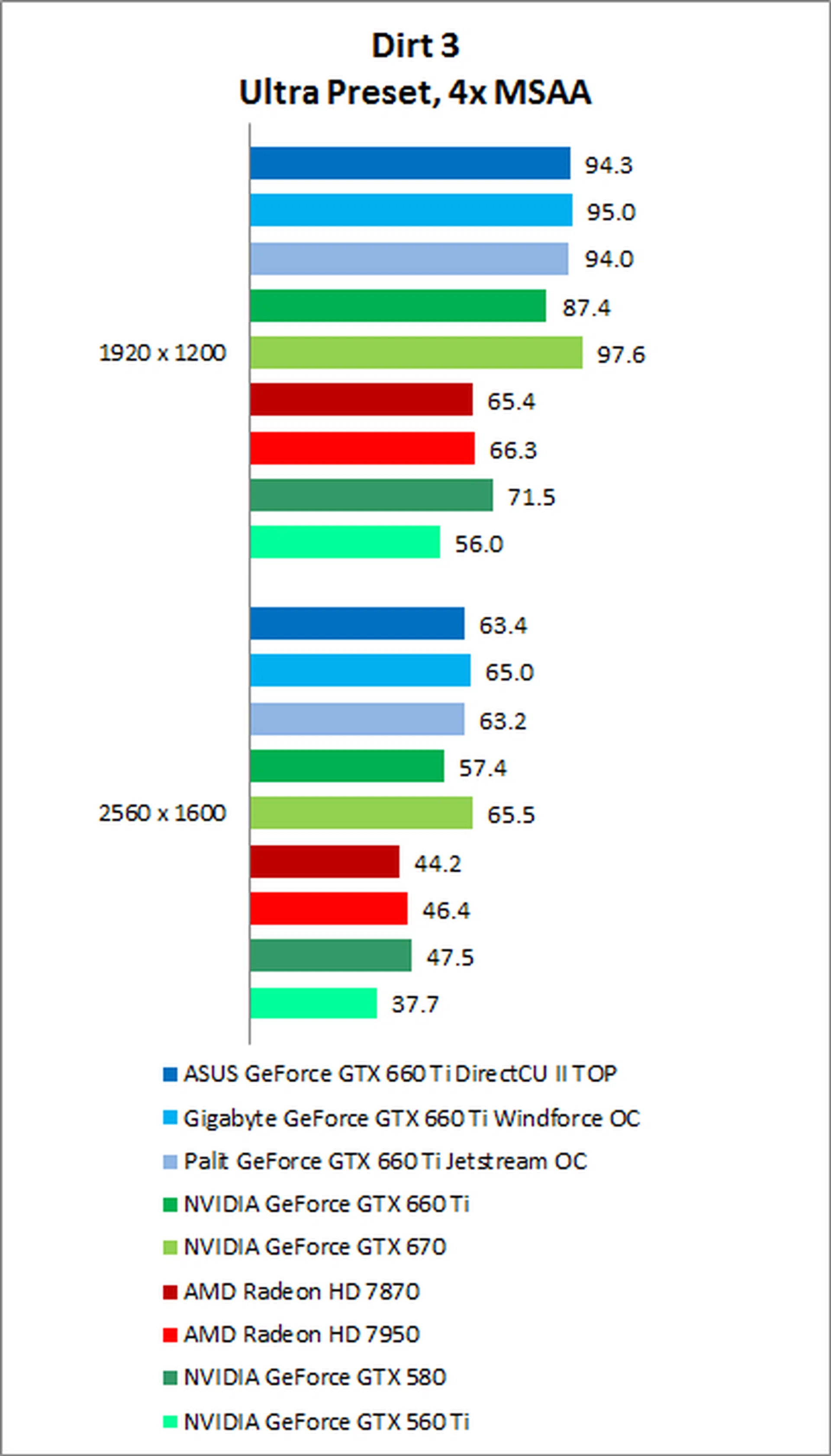 Despite Dirt 3 being better optimized for AMD cards, NVIDIA once again led the way, with the GTX 660 Ti posting excellent scores, this time beating the Radeon HD 7950 by a massive 30%, while trailing behind the GTX 670 by only 11%. The custom edition GTX 660 Ti cards came even closer to matching the GTX 670 with the Gigabyte card still maintaining its slight lead over ASUS and Palit at both resolutions.