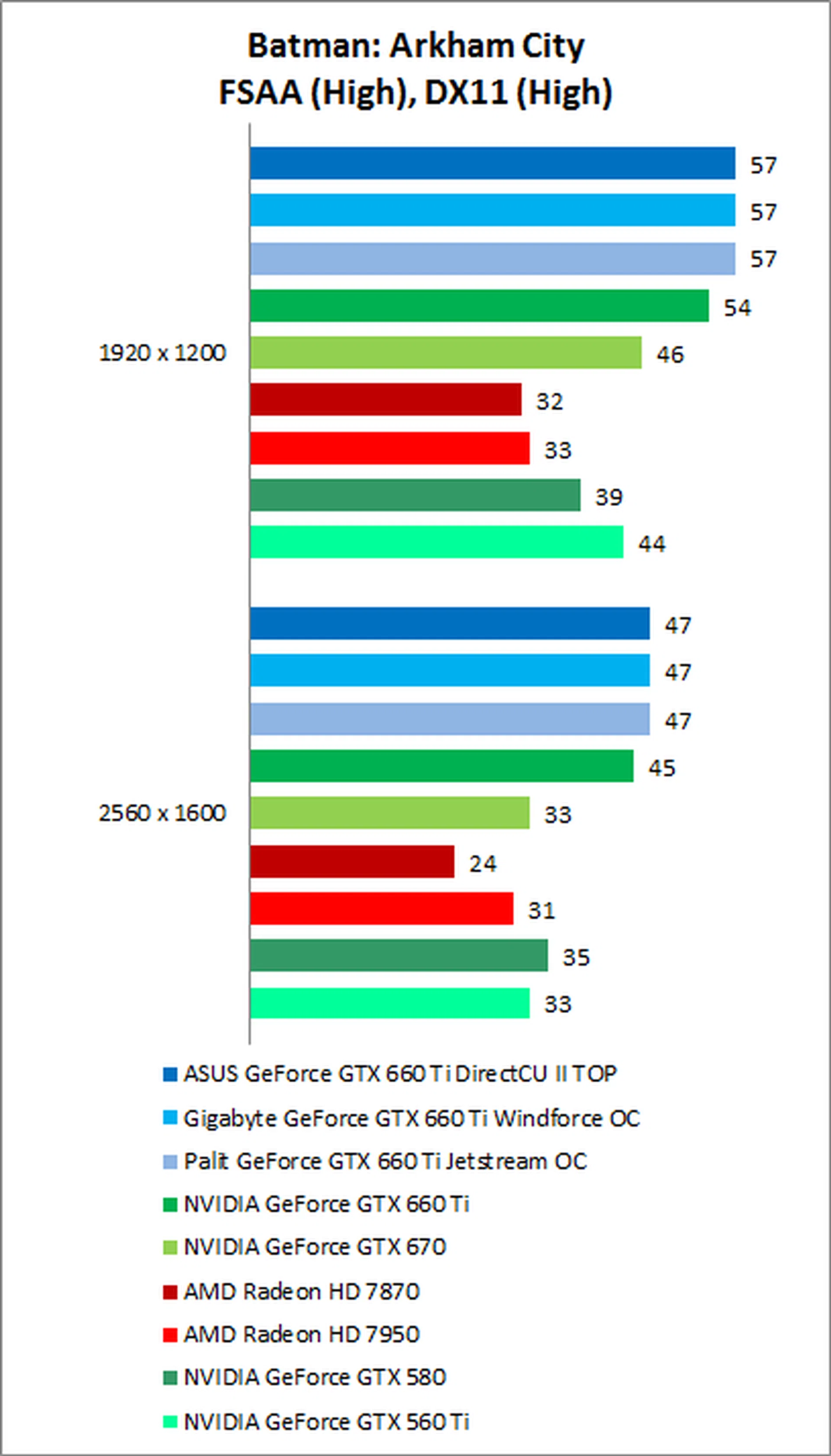 At the resolution of 2560 x 1600 pixels, it was still fairly impressive, scoring about 14% behind the more powerful GTX 670. At both resolutions, the GTX 660 Ti was much better than both the Radeon HD 7870 and the HD 7950, outperforming the former by about 35% and the latter by nearly 20%.