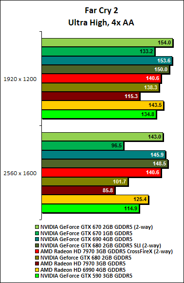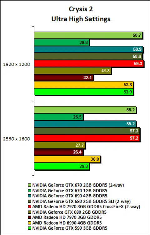 On more intensive games such as Crysis 2, we saw an even bigger increase in performance. At a resolution of 2560 x 1440, two GeForce GTX 670 cards in SLI netted an incredible 111% increase in performance over a single GeForce GTX 670.